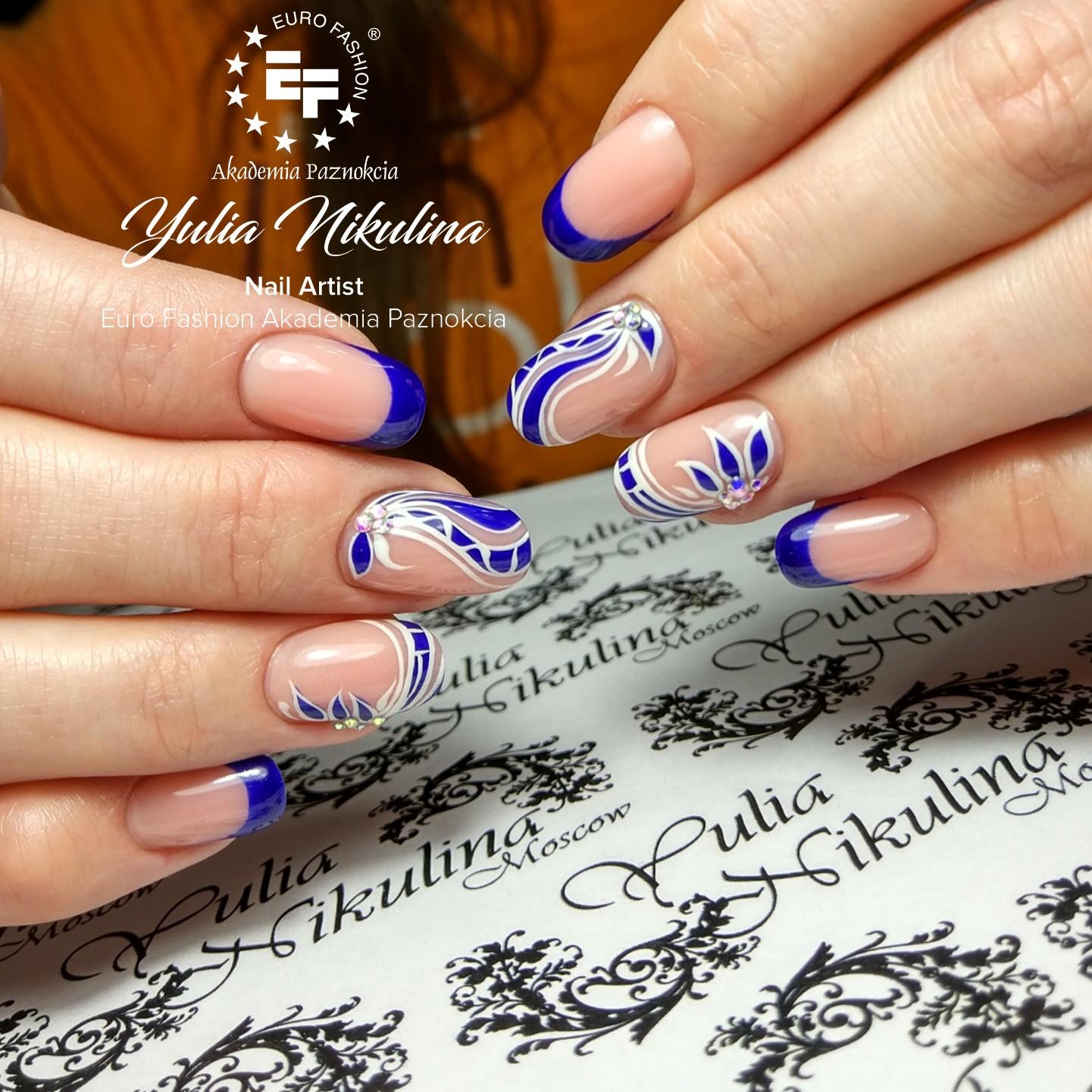 Одна из лучших идей — белый френч и цветы василькового цвета. Бутоны должны быть небольшими, стебли и листья — аккуратные тонкие линии. Розы, маки и другие красные цветы в 2022 году будут неактуальны. Поэтому их на ногти лучше не наносить.