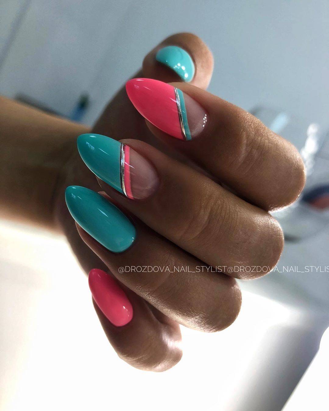 Разнообразить диагональный французский маникюр можно при помощи разноцветных элементов с использованием контрастных цветов.