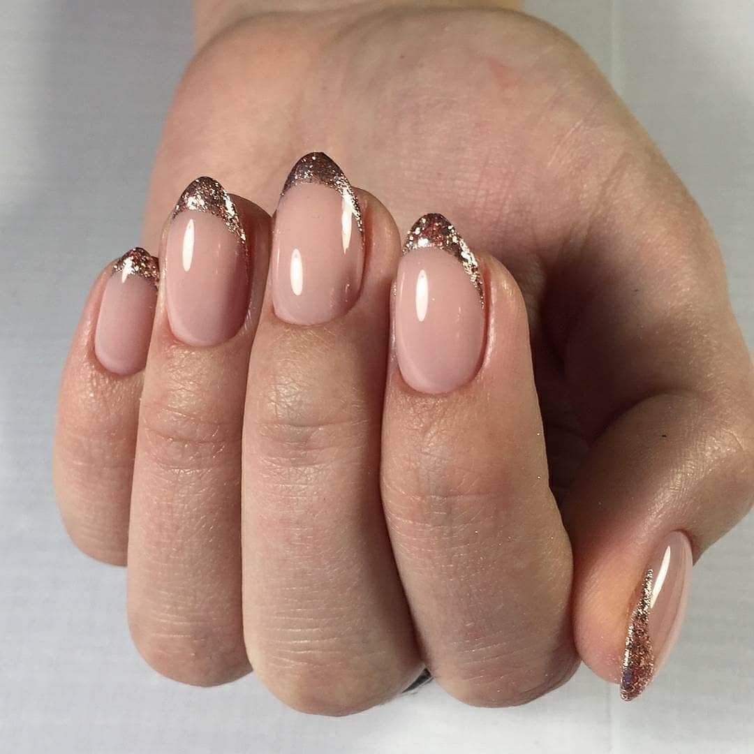 Отличная идея – с блестками, полностью покрывающими пластины безымянных пальцев и обрамляющими край остальных ногтей. База может быть выбрана цвета слоновой кости, блестки – серебряного. Это праздничная задумка, которая не подойдет на каждый день, но будет очень кстати на торжественном мероприятии, например, на свадьбе или юбилее. В сочетании с белым платьем или костюмом она идеально дополнит образ, сделав его симпатичным и запоминающимся.