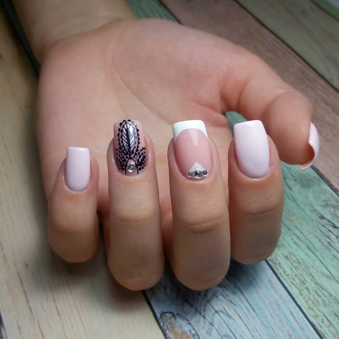 Как уже говорилось выше, классический френч – это база, поэтому можно смело дополнять ее различными рисунками. К примеру, геометрический дизайн часто бывает насыщенным, дерзким. В данном случае это неприемлемо, ведь намного более интересно будут смотреться легкие минималистичные линии или фигуры. Такое сочетание – прекрасное решение даже для повседневной жизни.