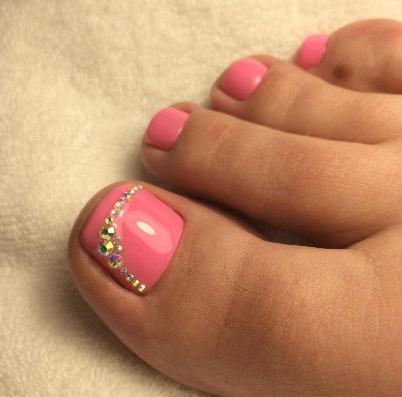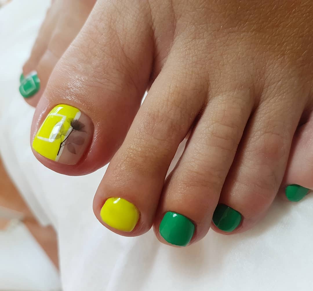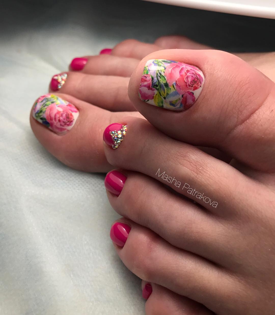Для летнего дизайна можно использовать практически всю палитру ярких оттенков. Красный, розовый, желтый, зеленый и другие – все это может красоваться на ваших ноготках. В качестве акцентов используйте гель-лак с глиттером, покрыв им 1-2 пальца на ногах или слайдеры с цветочным декором. Слайдеры рекомендуется размещать на большом пальце, чтобы узор был заметен и хорошо различим. Что касается линии «улыбки», то ее можно выполнять как в глянцевом, так и в матовом варианте.