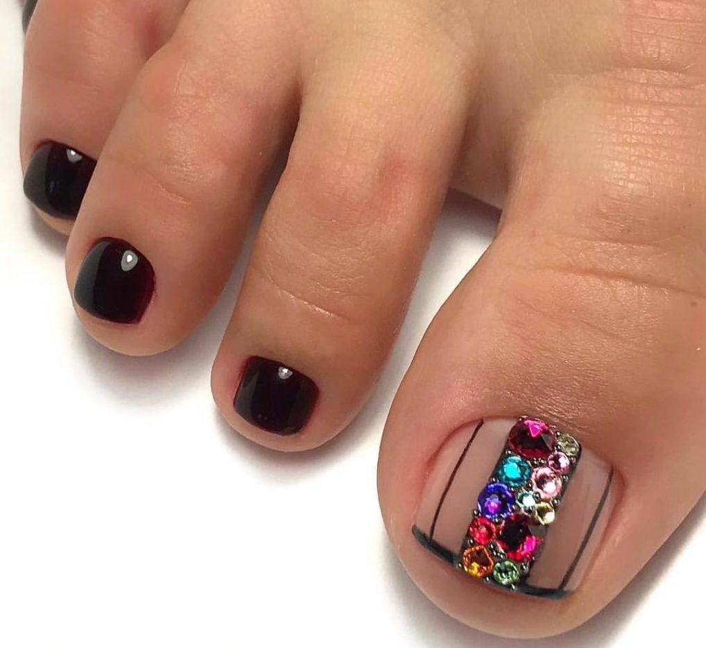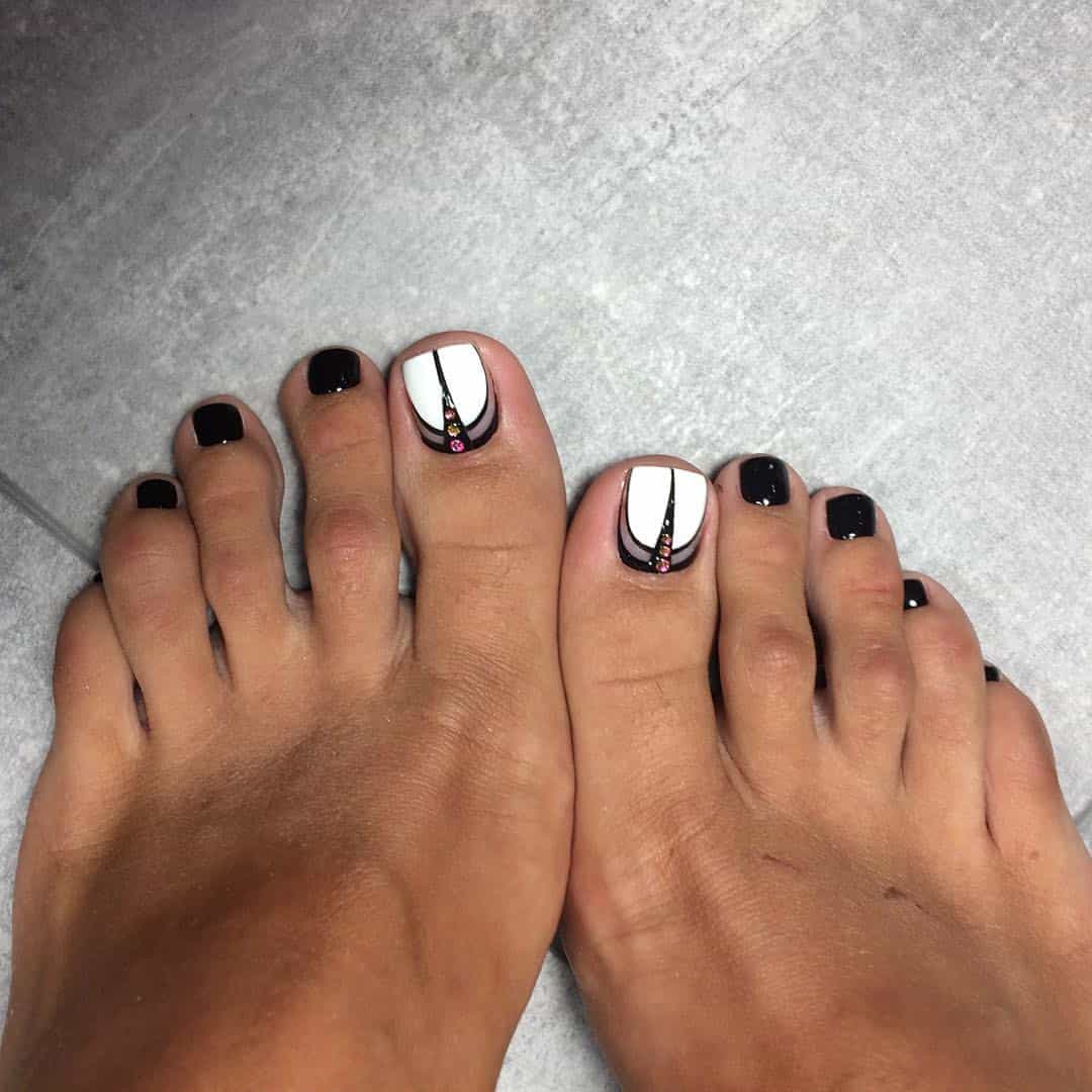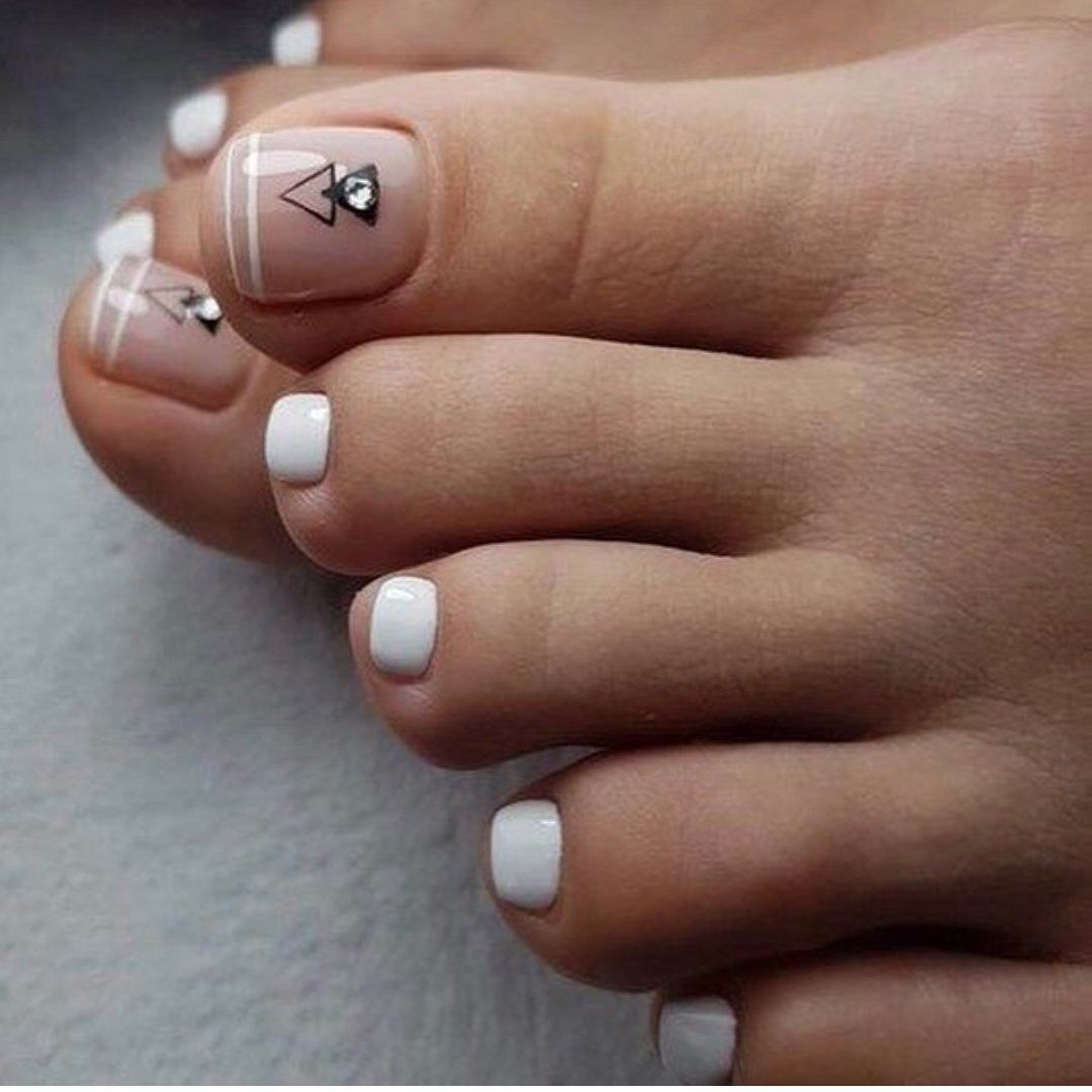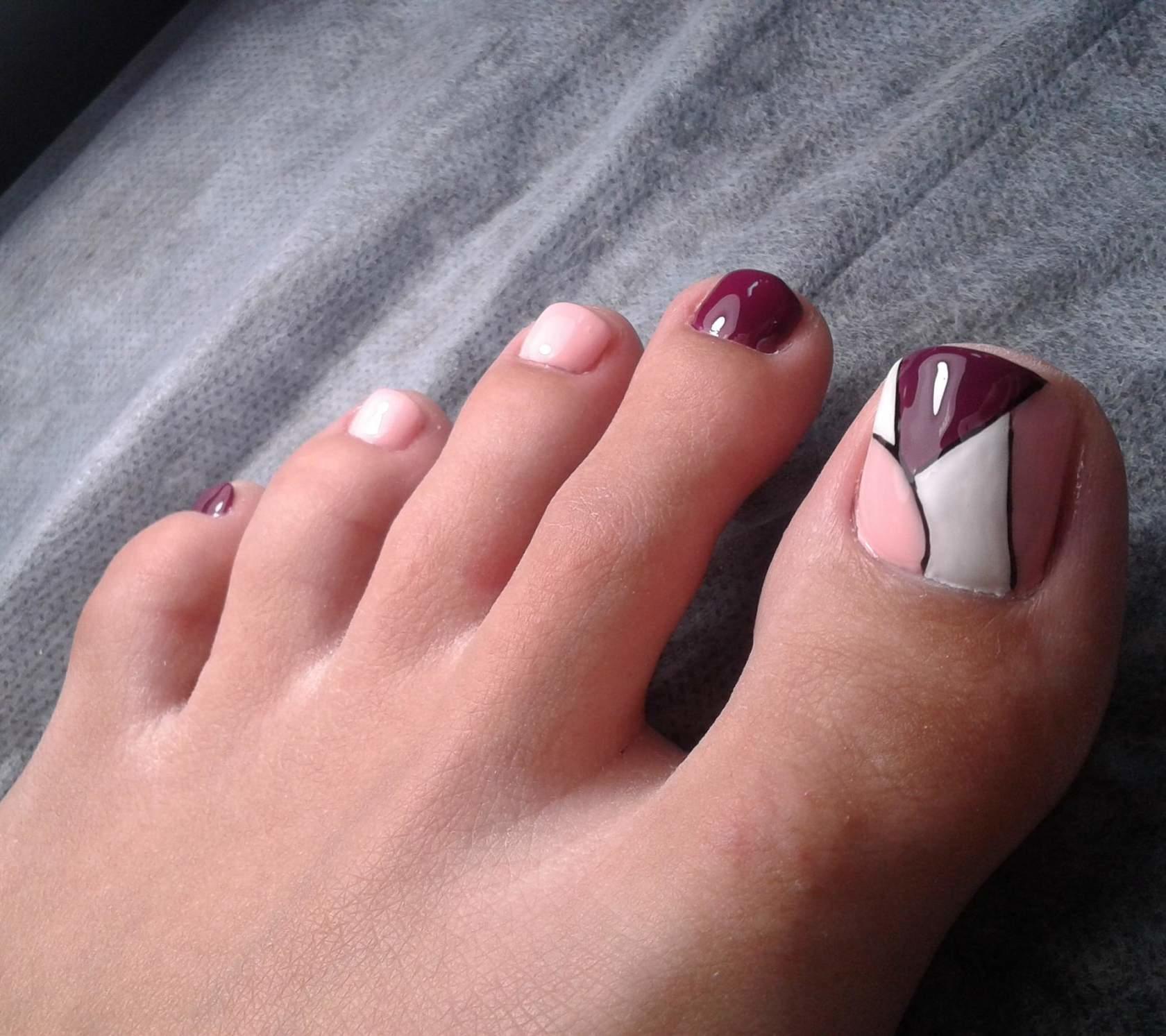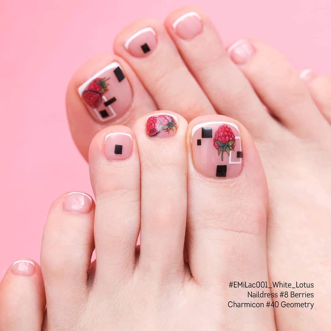 Данный педикюр отличается четкими графичными линиями и пропорциями. Они пересекаются друг с другом, образуя геометрические узоры.