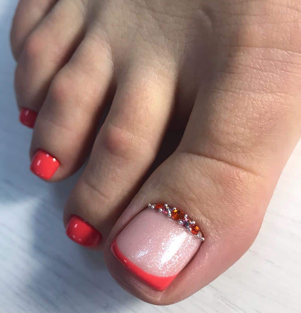 Если классический французский педикюр вас не устраивает, то можно его разнообразить. Например, попробовать базовое покрытие яркого цвета. Белый хорошо сочетается с красным или алым оттенком. При этом процедура повторяется в точности, как и в классическом варианте.