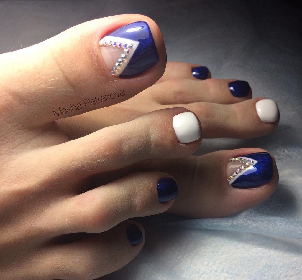 Педикюр в морском стиле выделяется благодаря насыщенным цветам, характерным для морской тематики. Для дополнительного декора можно использовать блестящий лак, а также узоры в виде ракушек, камушков и атрибутов моряков.