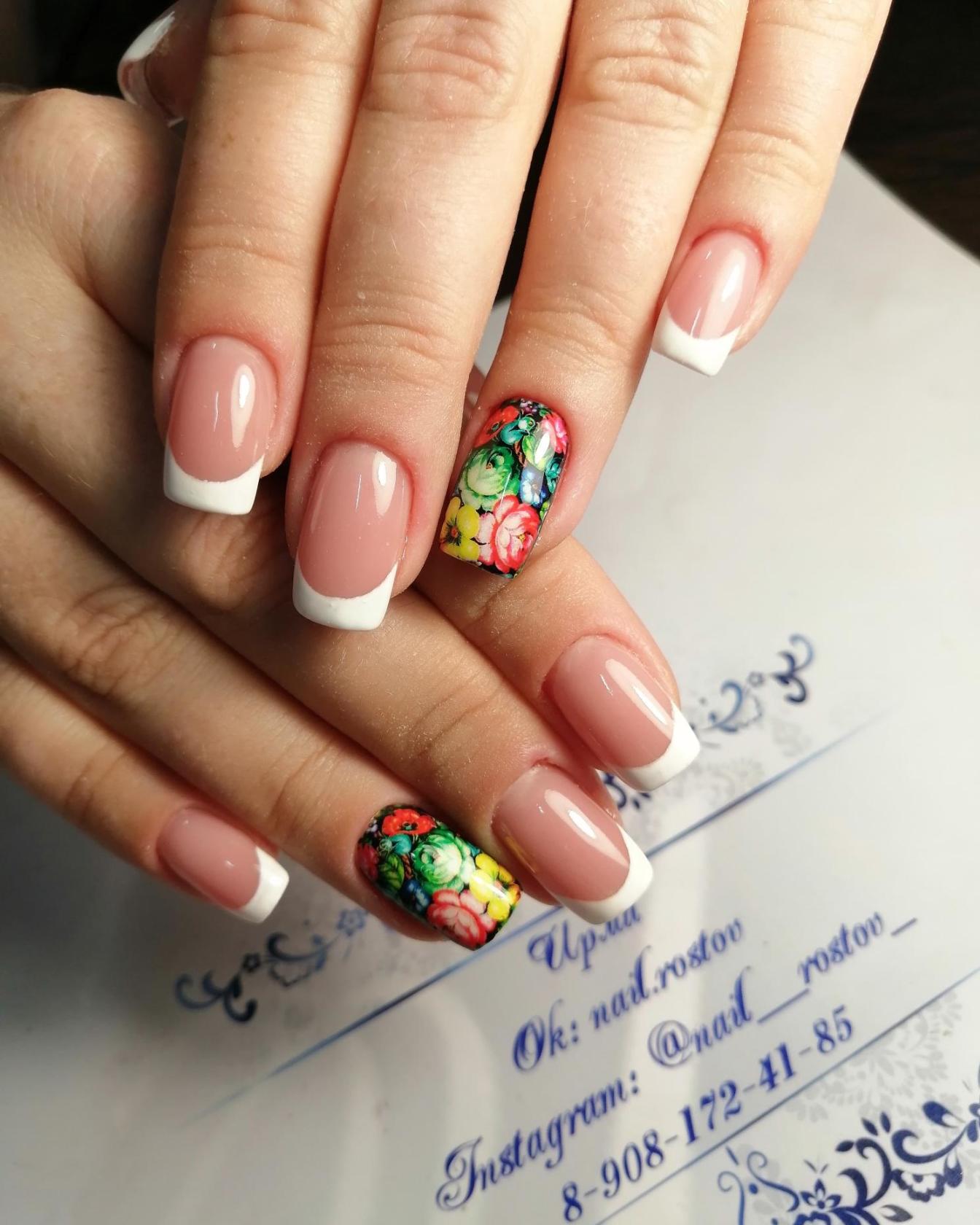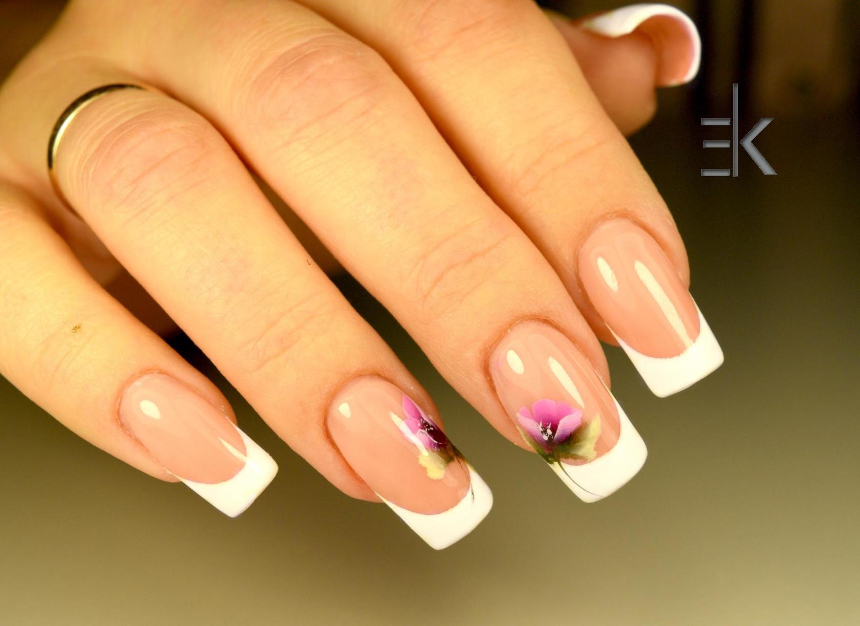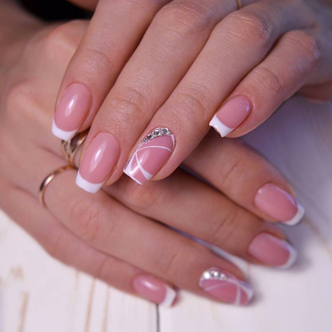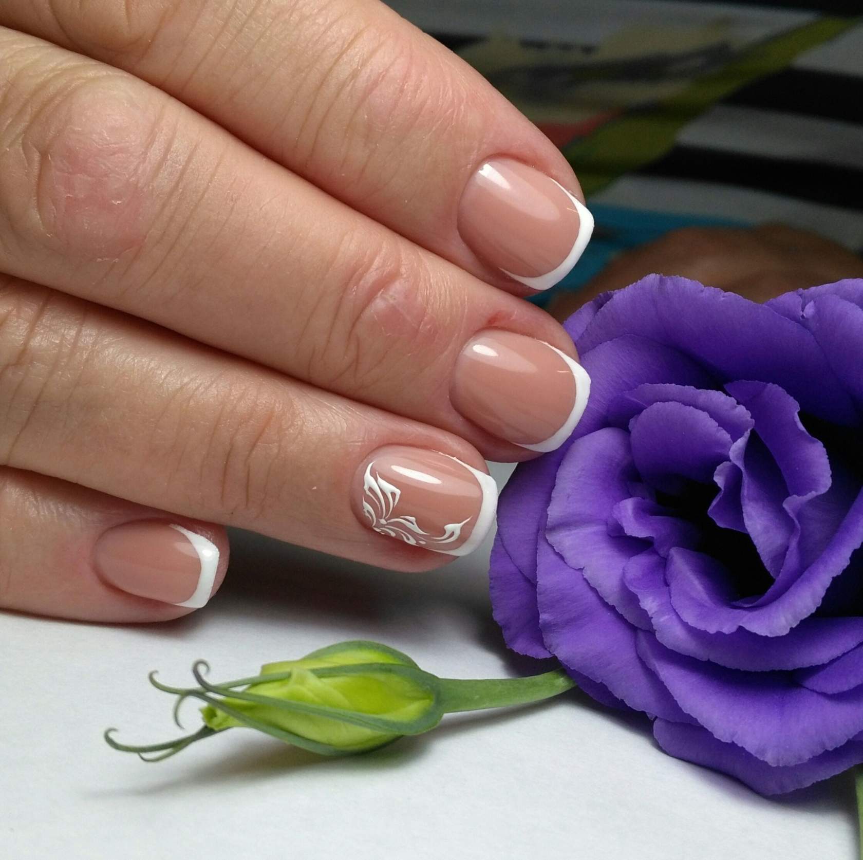 Выглядит он следующим образом: весь ноготь покрывается натуральной базой, нежным розовым, бежевым цветом, имитируя натуральный ноготь, а кончик ногтевой пластины вырисовывается белым цветом в форме «улыбки».