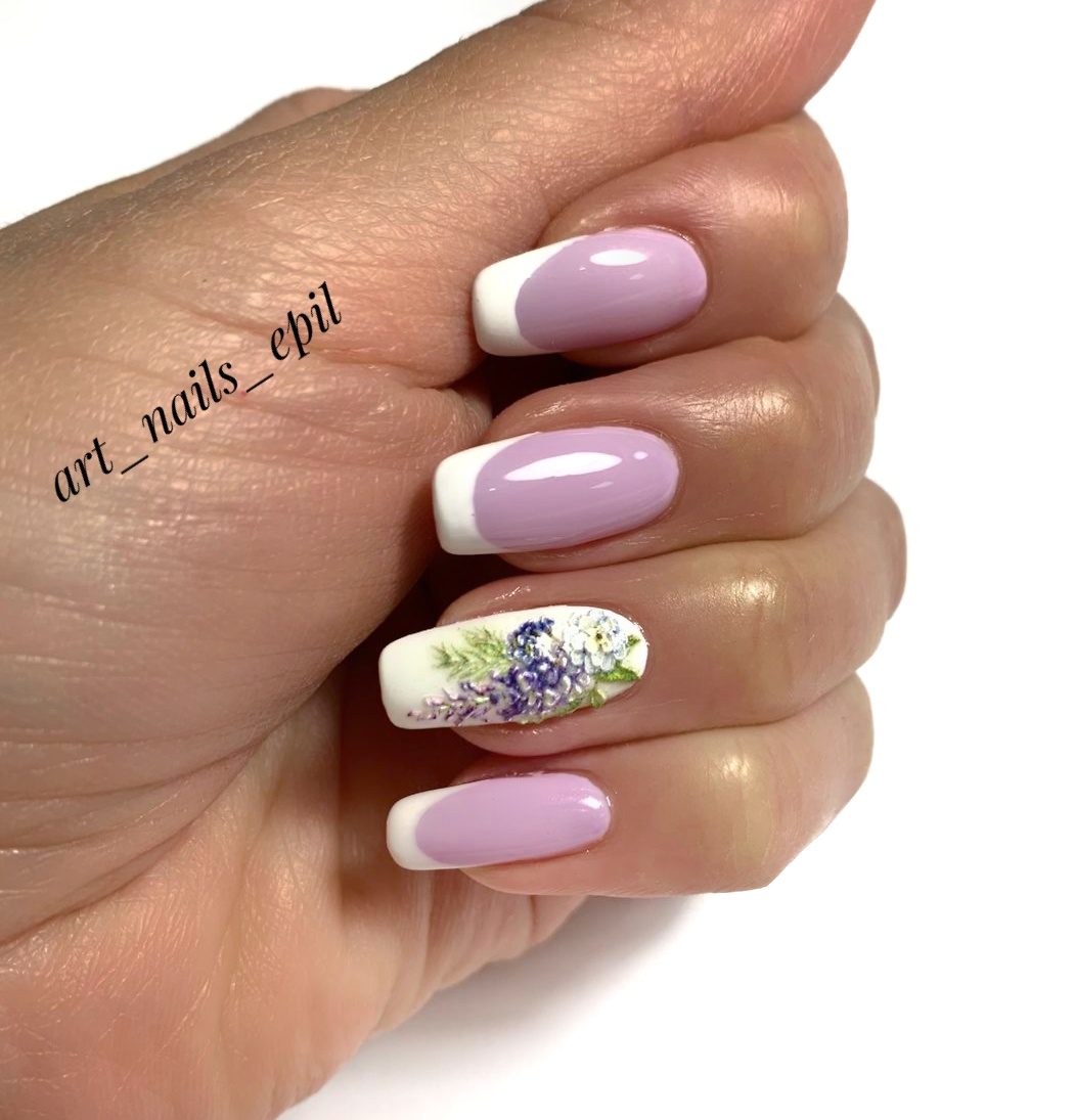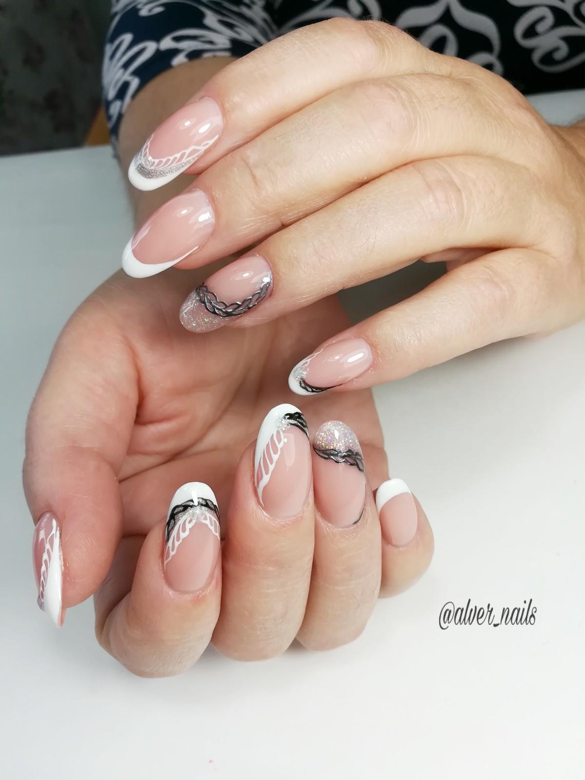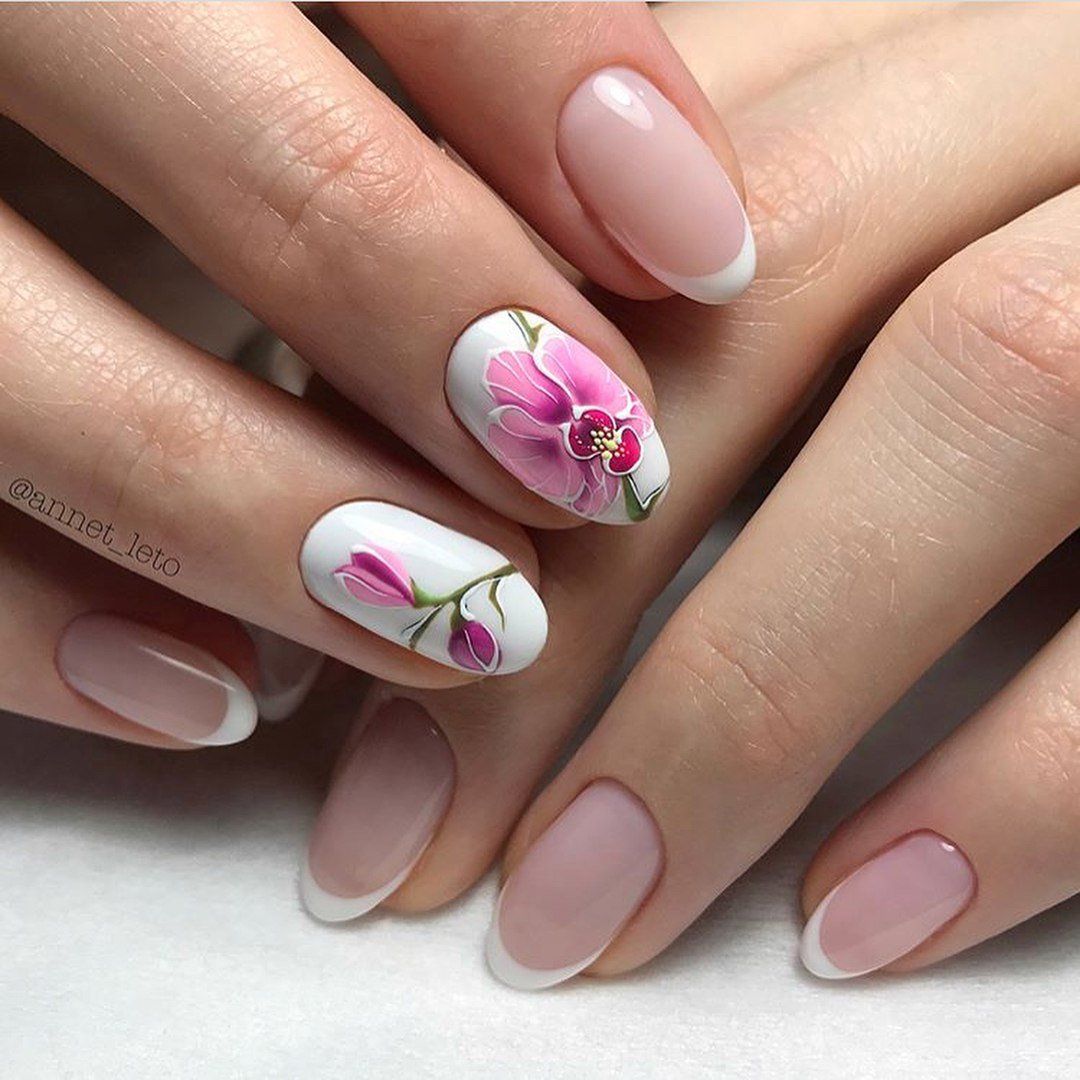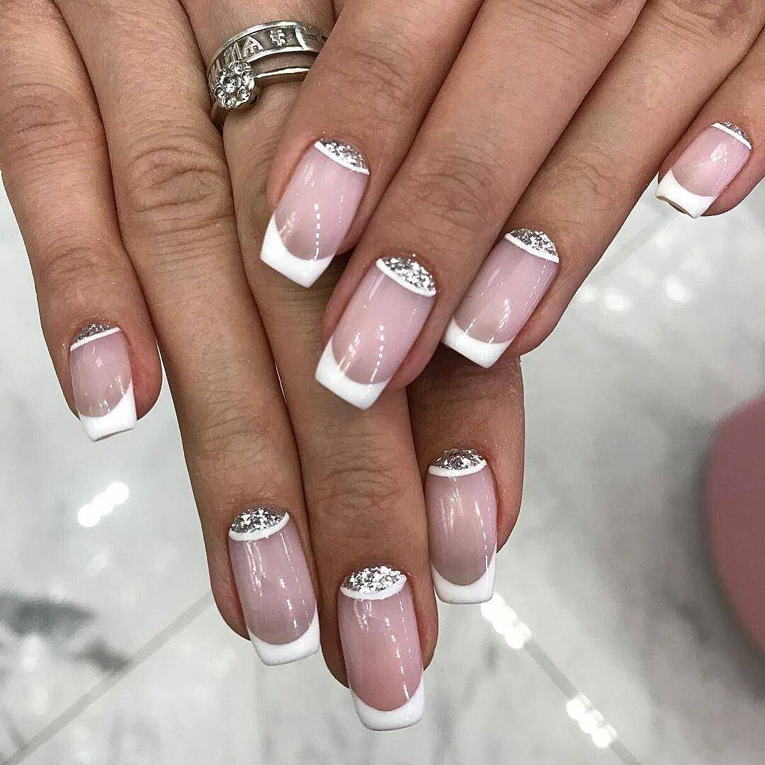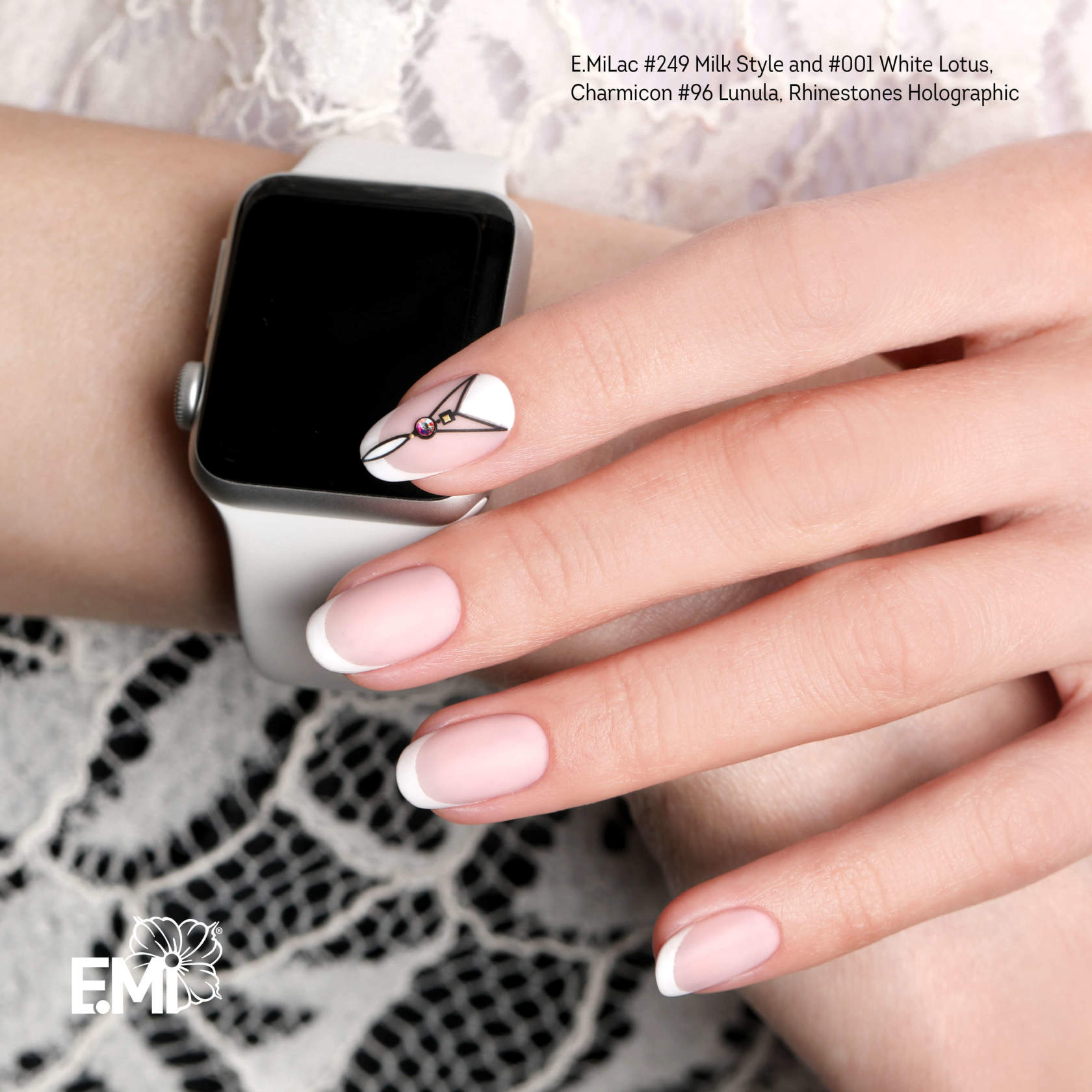 Выглядит он следующим образом: весь ноготь покрывается натуральной базой, нежным розовым, бежевым цветом, имитируя натуральный ноготь, а кончик ногтевой пластины вырисовывается белым цветом в форме «улыбки».
