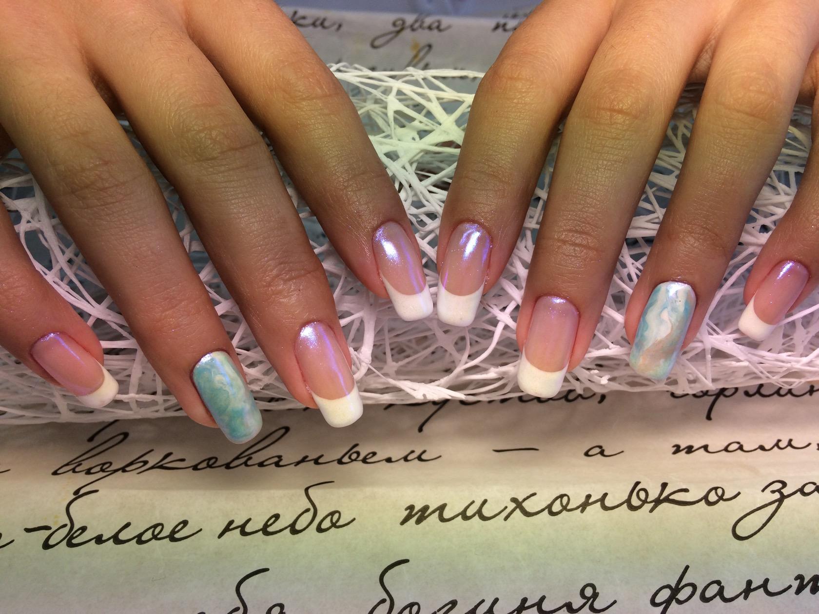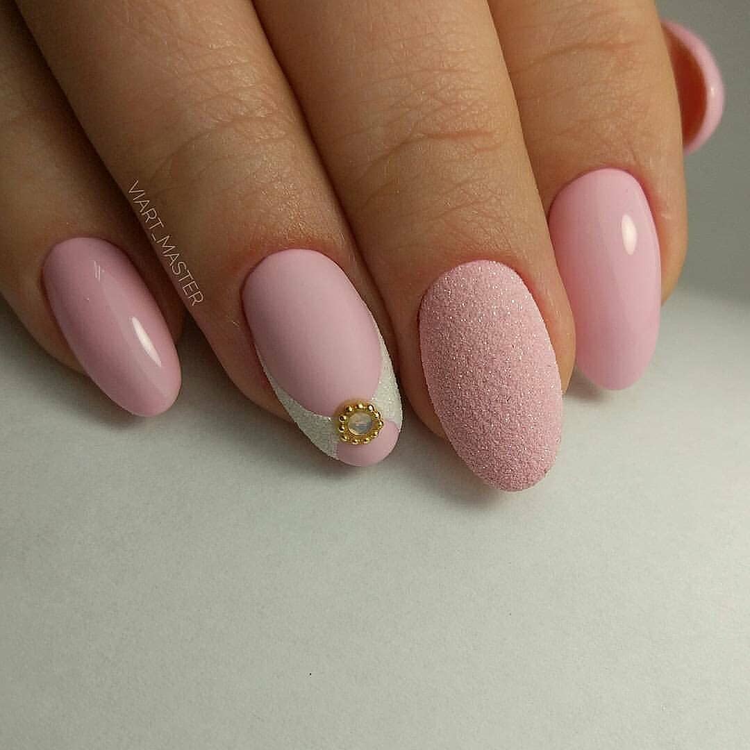Как будто свет звезд собрался на Ваших ноготках. В данном варианте соблюдены все классические каноны маникюра – пастельная основа и стандартное выделение кончика ногтя, но не лаком, а блеском. Такое украшение ноготков подойдет для любого случая – похода на свидание, День Рождения, концерта и так далее.