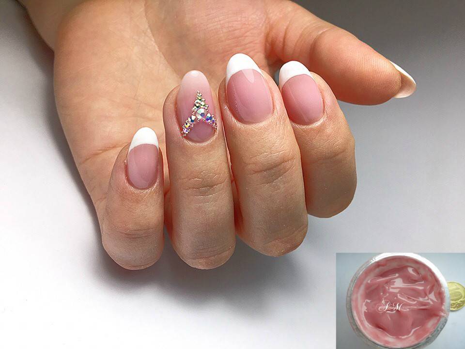 Такой метод подойдет тем, кто не умеет выводить ровную улыбку с помощью кисти. Сформировать основание ногтя и улыбку можно с помощью структурирующих гелей разных оттенков.