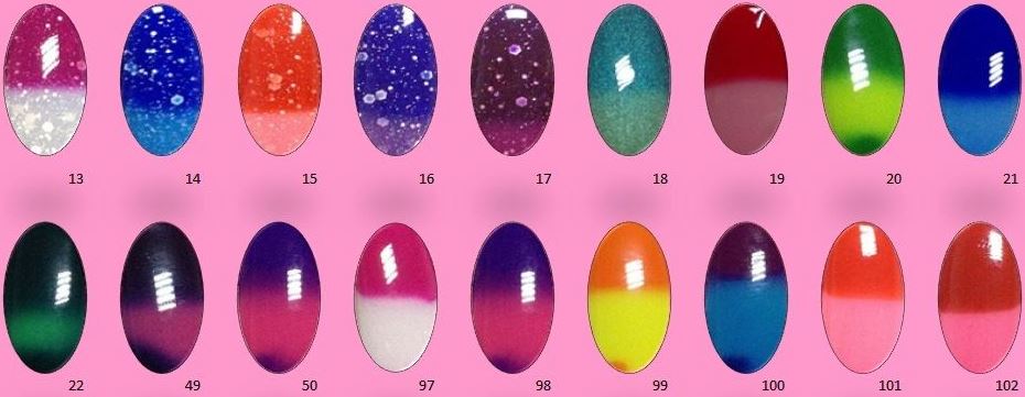 Например, с коричневого на розовый, или с синего на золотой. Кроме того, можно приобрести термо гель с крупными или мелкими блестками.