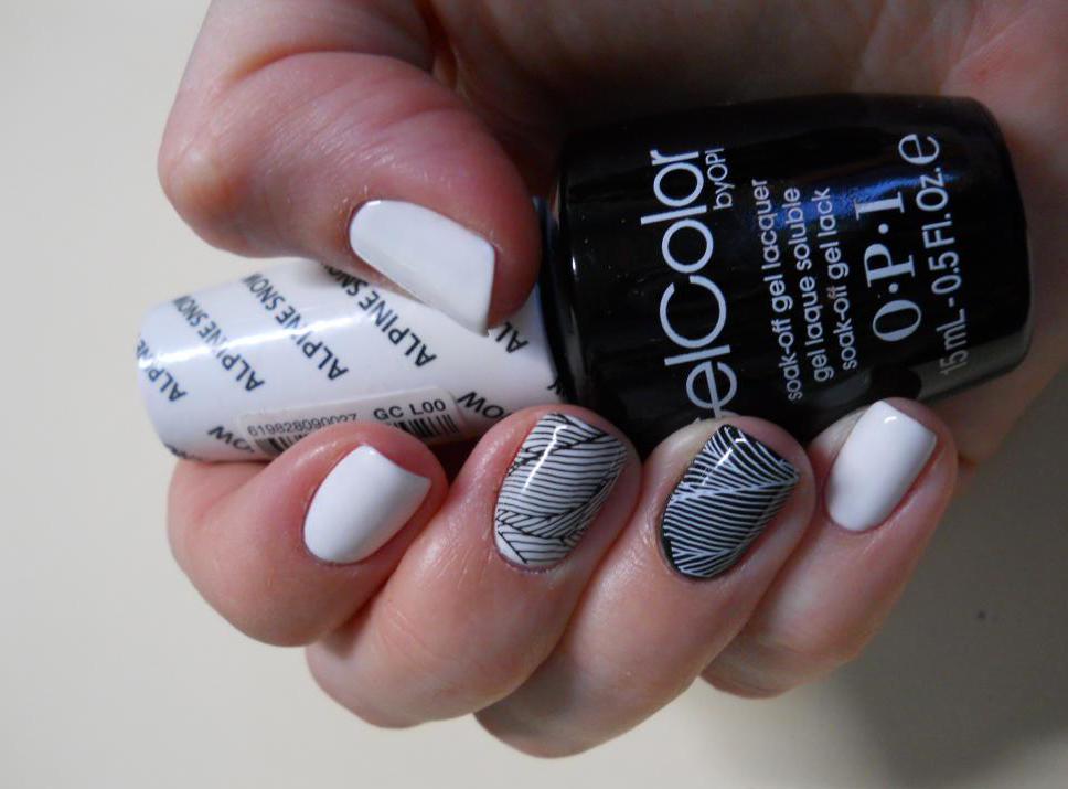 Для составления сложных дизайнов подойдут любые светлые гель-лаки. Фото возможного варианта демонстрирует отпечатанный стемпинг на акцентных пальцах. По белому фону сделан узор цвета основного покрытия. Со стемпингом делают и дизайн «Разные руки»: отпечатывают разные узоры контрастным цветом, оставляя одинаковым фон.