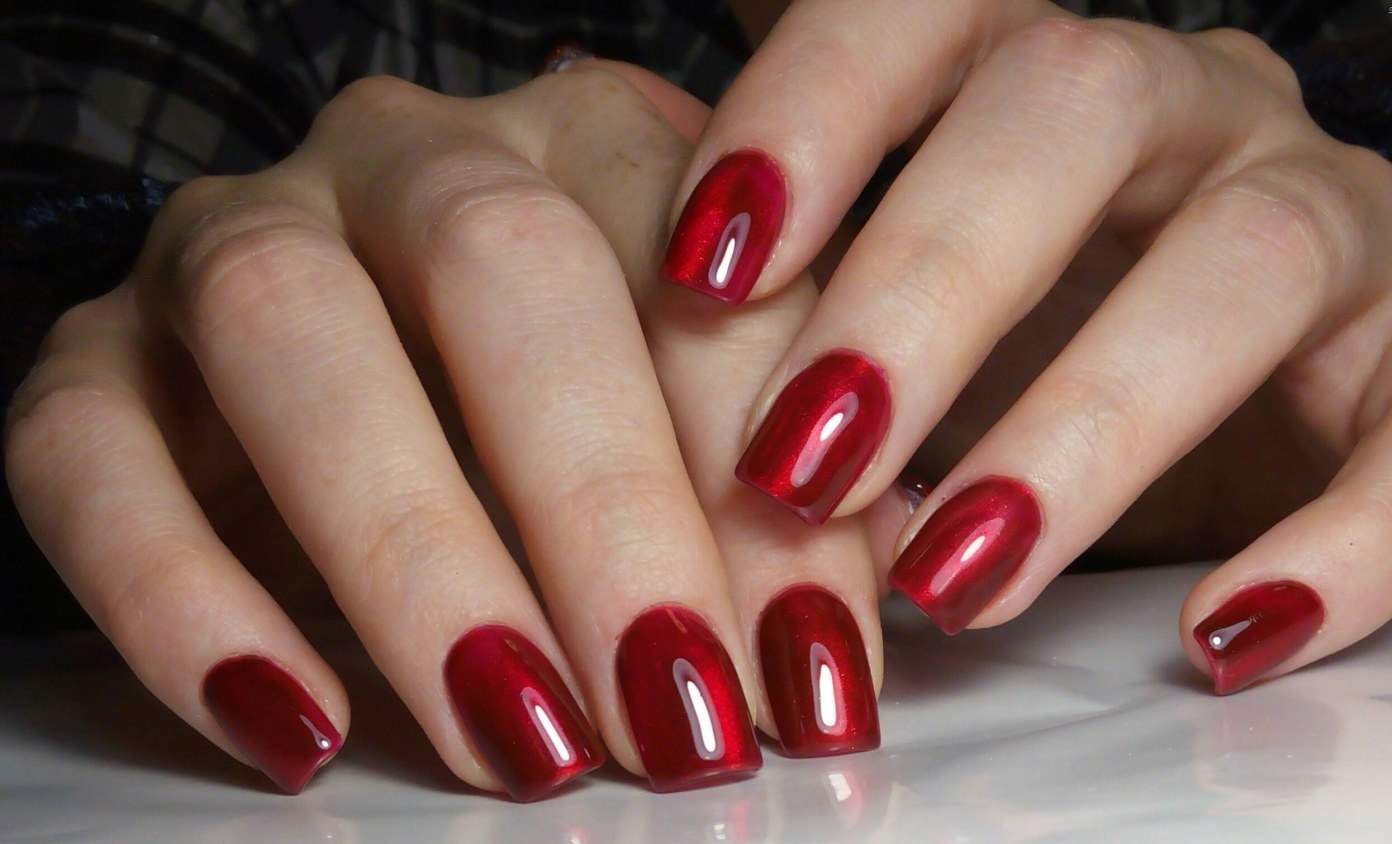 - Красные тона хороши для разного возраста, особенно, если подбирать помаду аналогичного оттенка. Форма и длина ногтей может быть разной, чтобы красный цвет смотрелся гармонично. К этому цвету маникюра можно подобрать различные украшения. Особенно эффектно смотрятся жидкие камни, слюда или фольга.