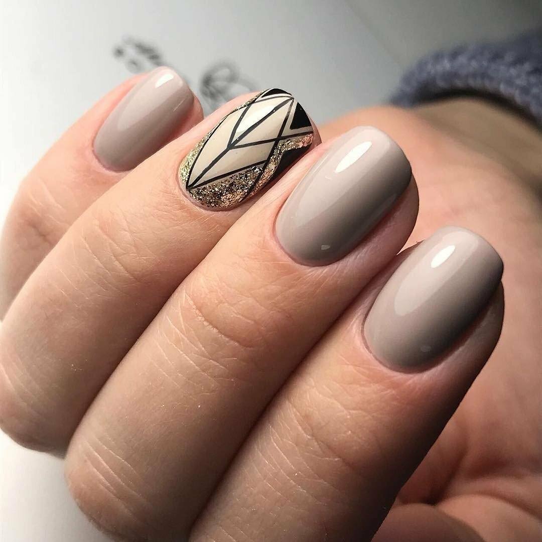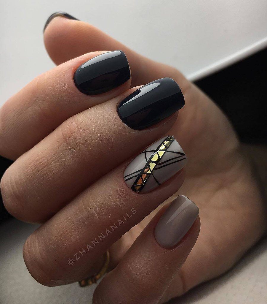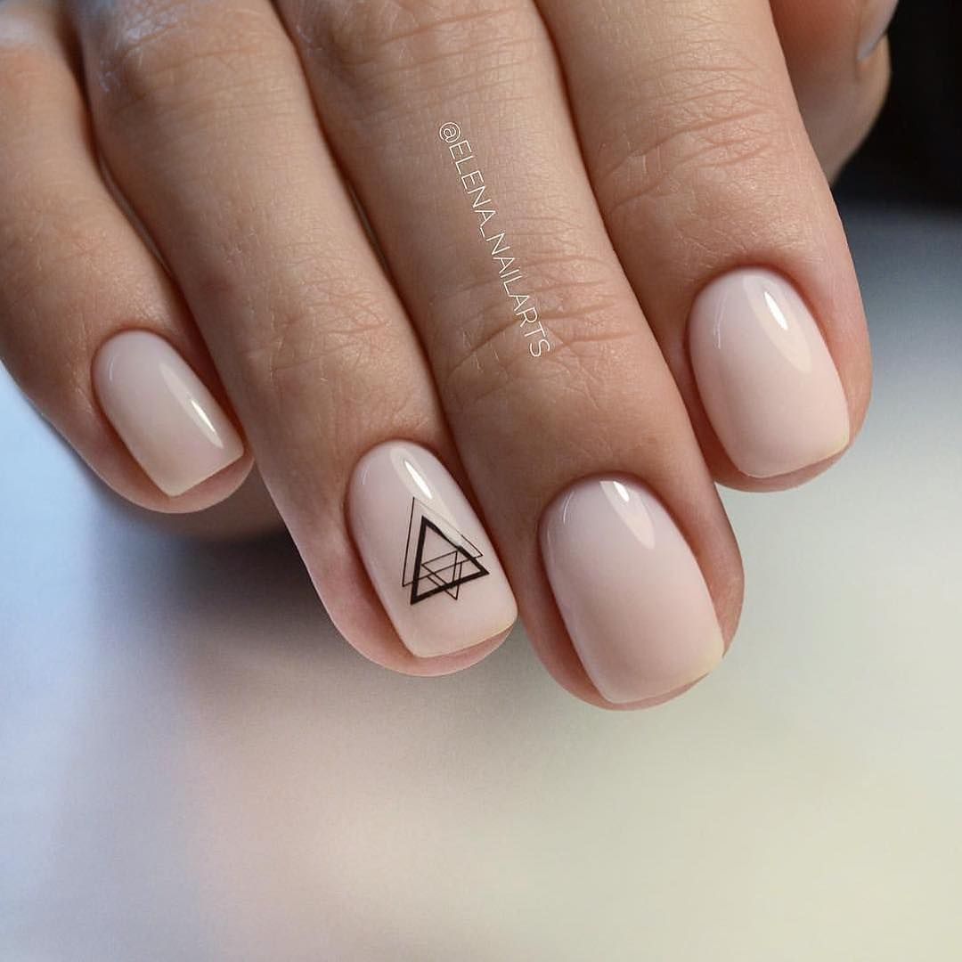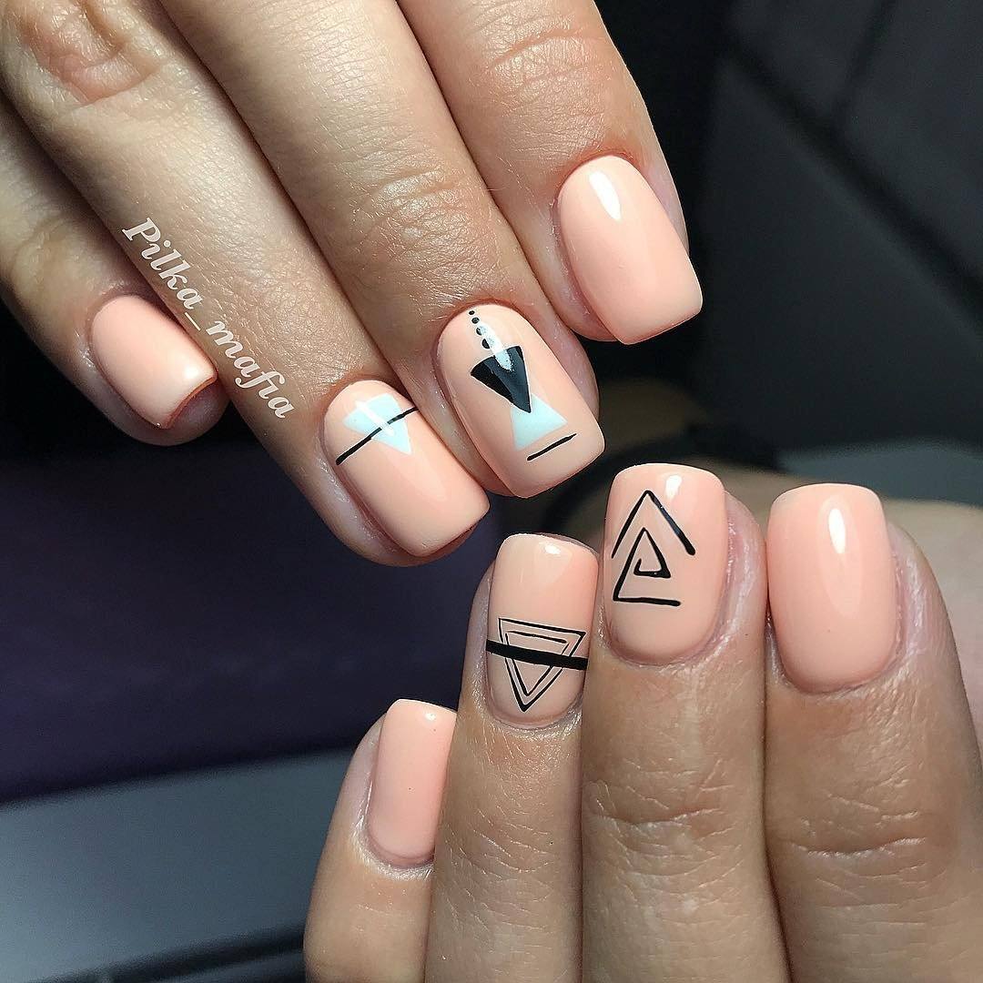 На коротких ногтях великолепно смотрится маникюр с абстрактными фигурами. Например, стильно выглядит дизайн с треугольниками, точками, тонкими полосками и другими фигурами. Чтобы ноготки визуально смотрелись длиннее выполните дизайн с треугольниками, острый угол которых устремлен к краю ногтевой пластины.