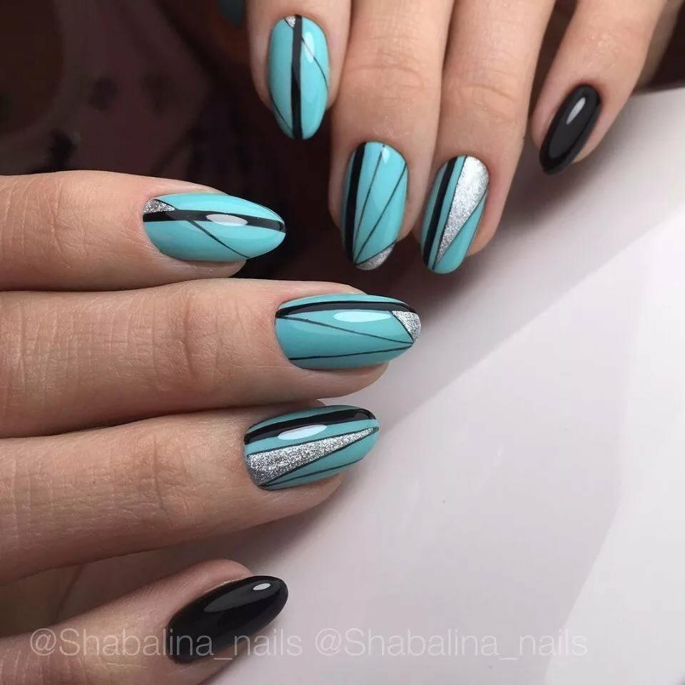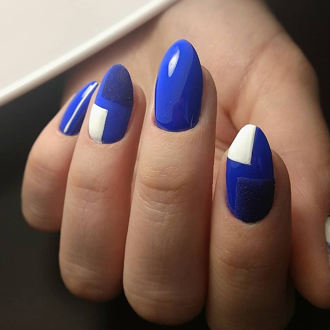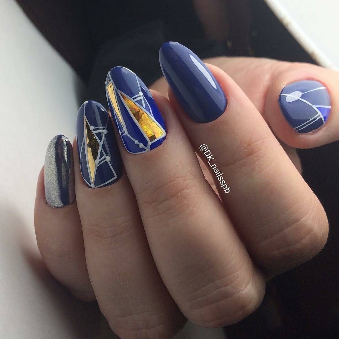 Бесподобный синий маникюр и оригинальные геометрические рисунки на нескольких ногтях