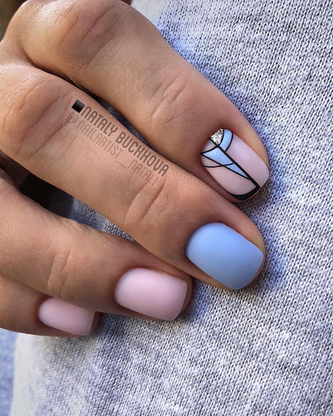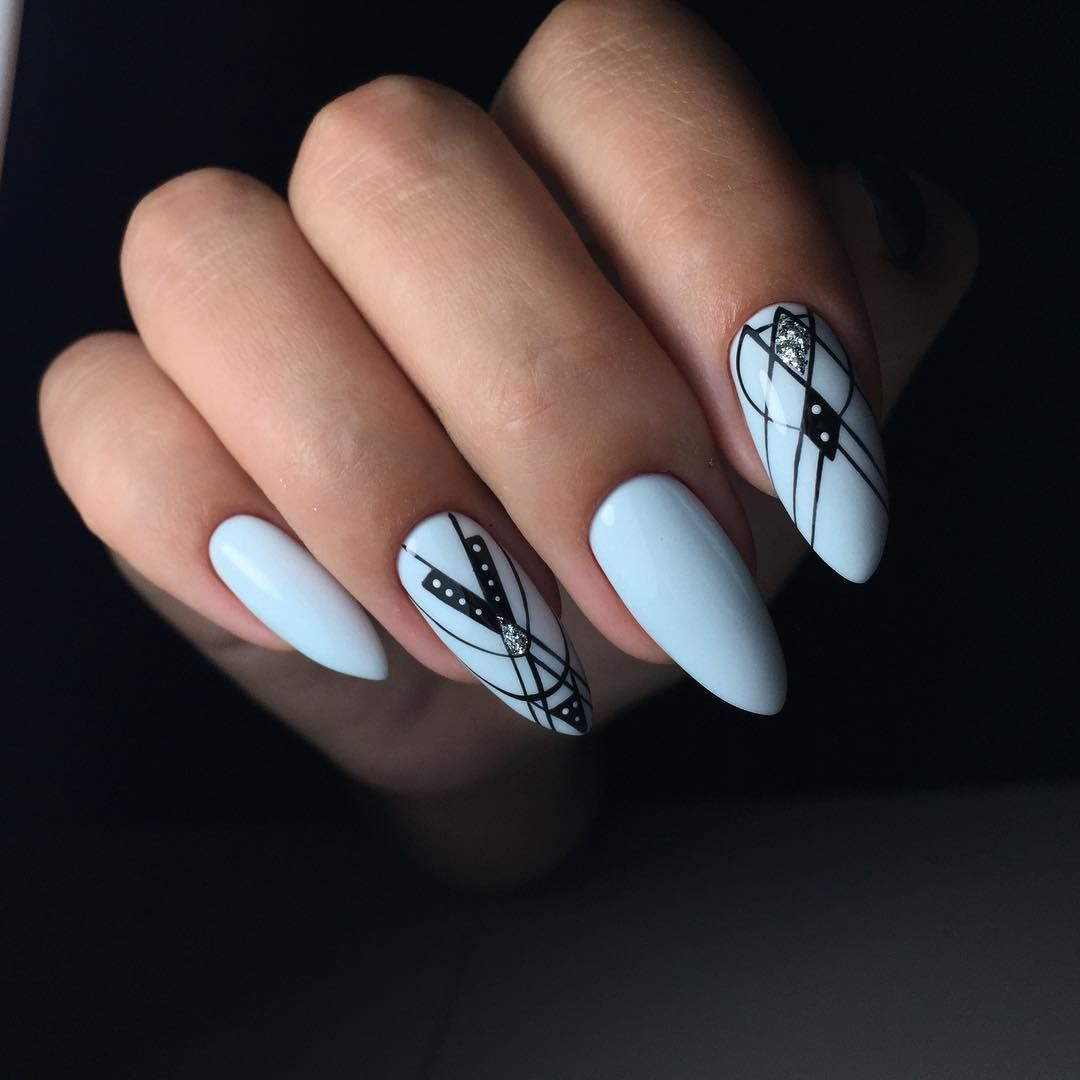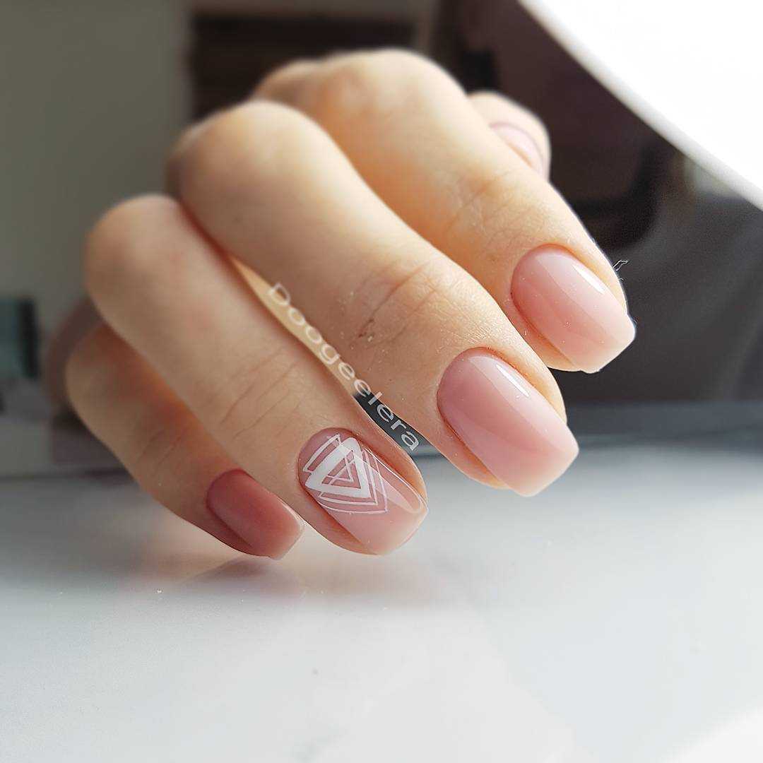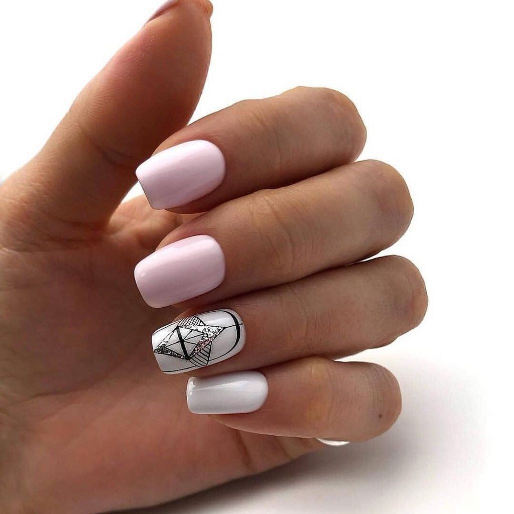 Дизайн с геометрией – универсальное решение для ногтей любой формы и длины, поэтому его смело можно создавать на коротких и ультра-коротких ноготках. Маникюр с геометрией желательно выполнять в светлых тонах: белом, розовом, голубом, сером, кремовом и других.