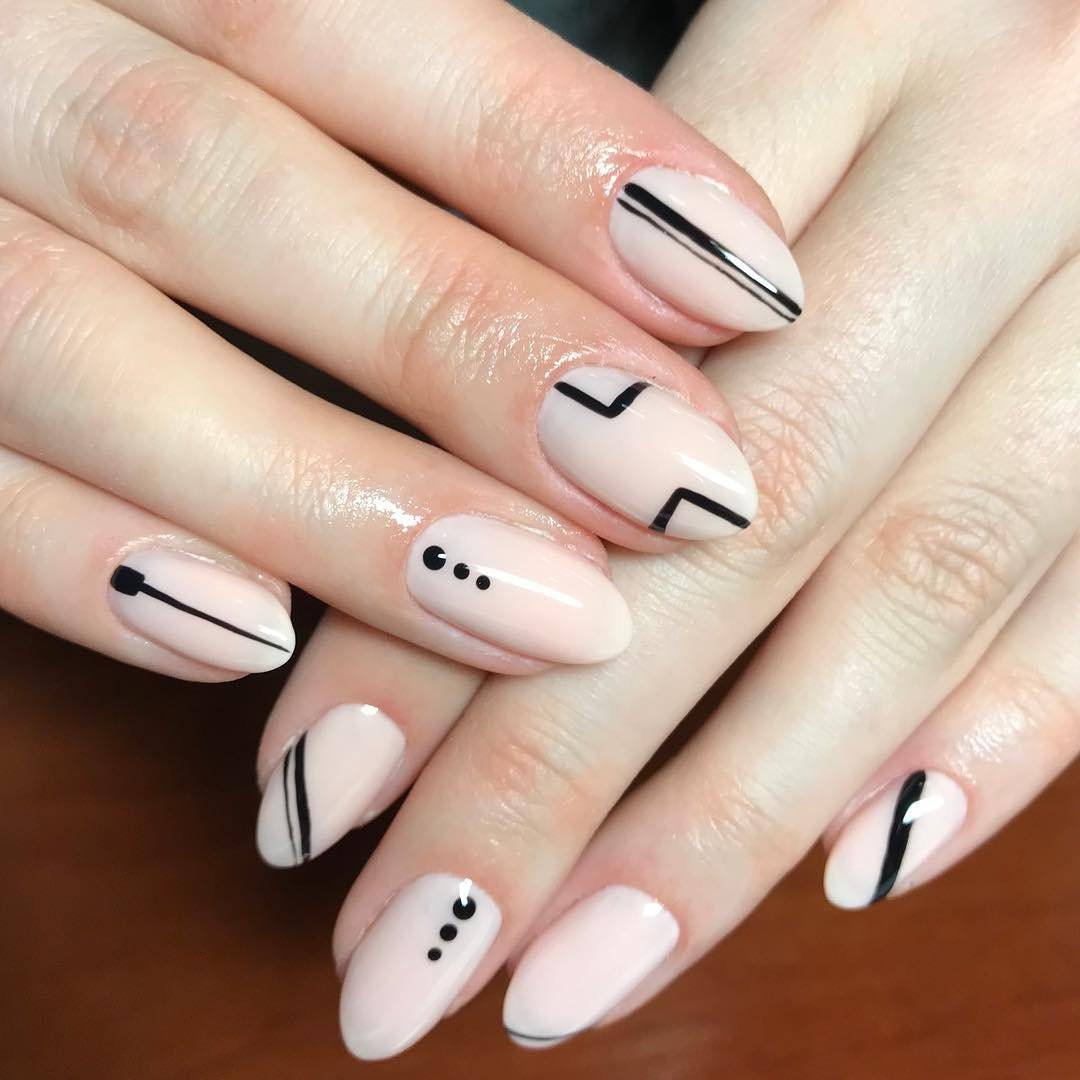 Наигравшись со сложными фигурами, девушки все чаще располагают на ногтях геометрию минимализм, полоски и точки, которые не акцентируют внимание на ногтях