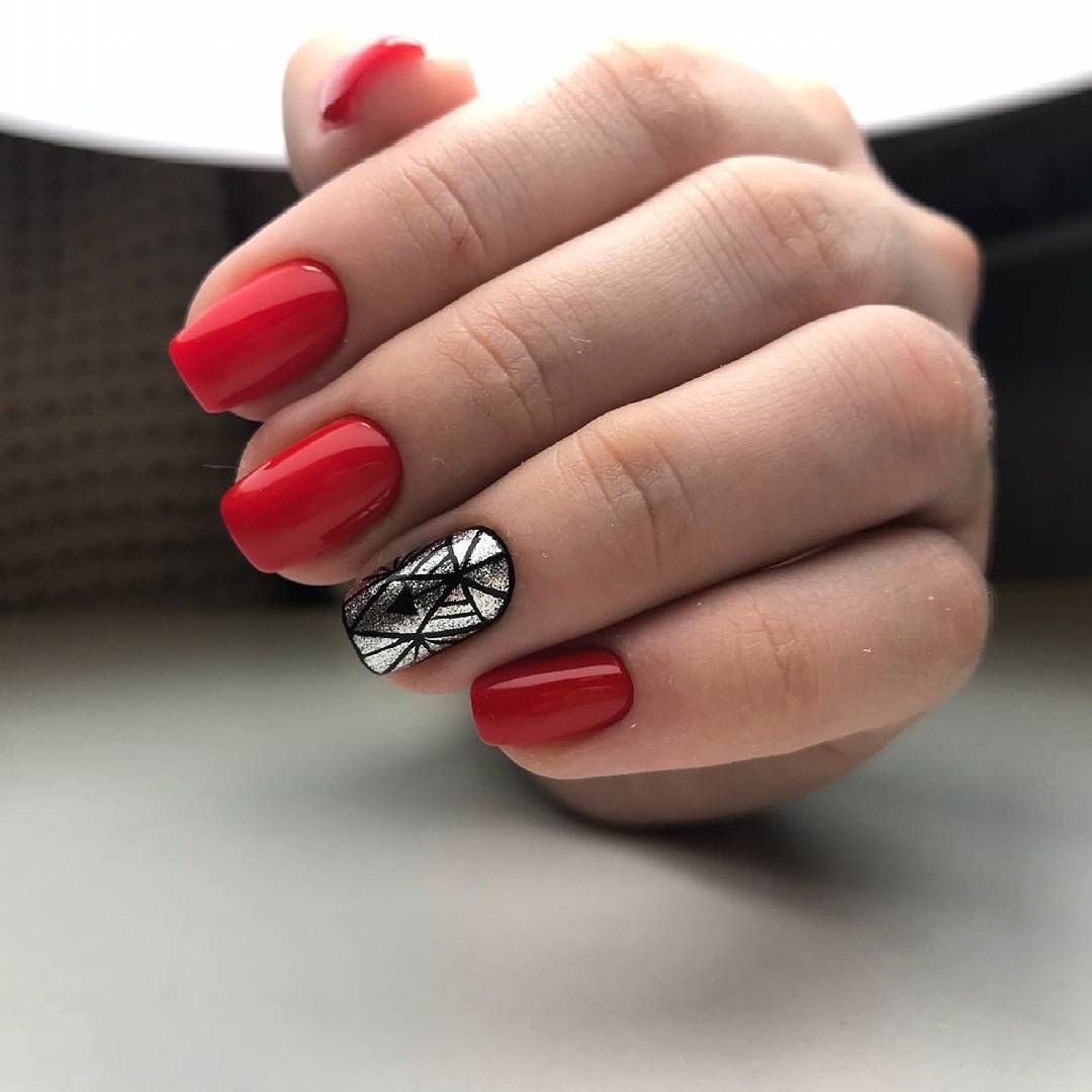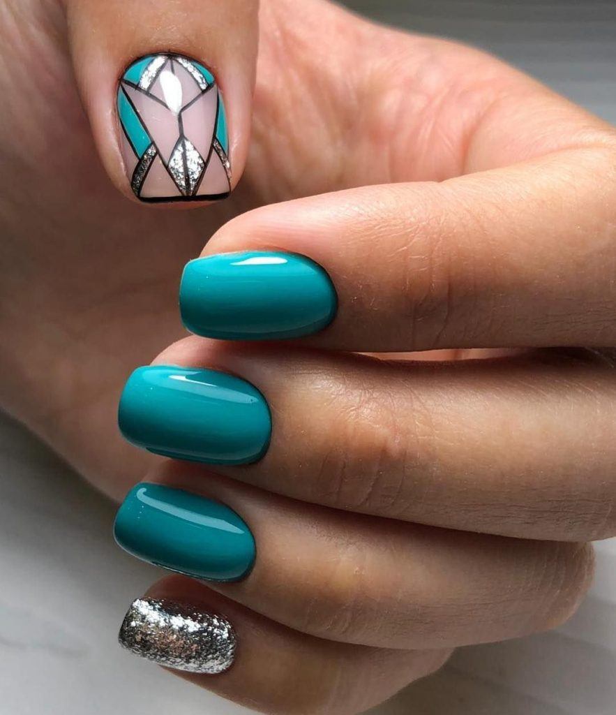 Здесь важно учитывать, что основное покрытие должно быть на всех ногтях одного цвета, равно как геометрические фигуры, созданные с помощью клейких лент или других элементов декора ногтевых пластин.