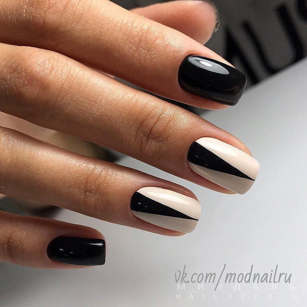 Контрастные черно-белые географические фигуры на ногтях на бежевой подложке