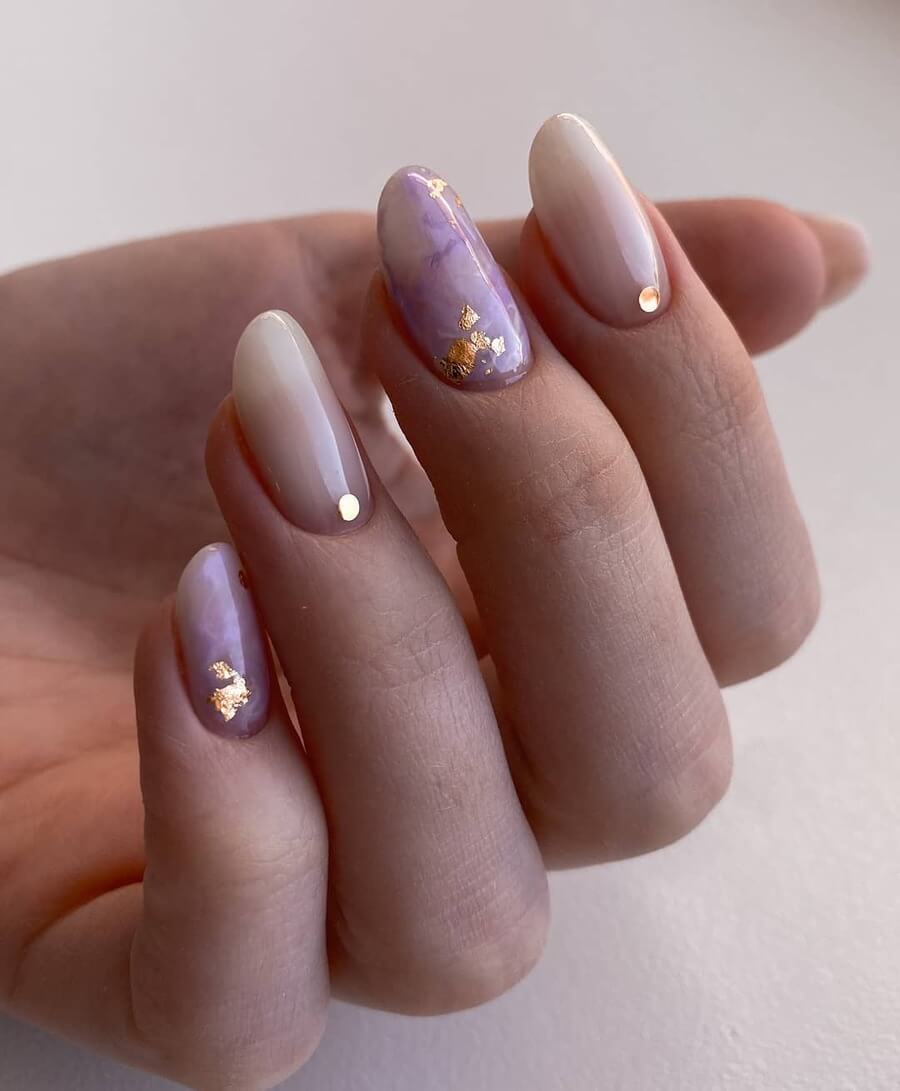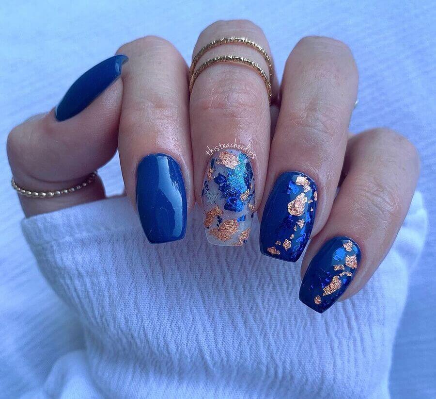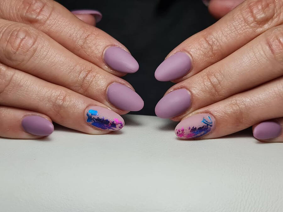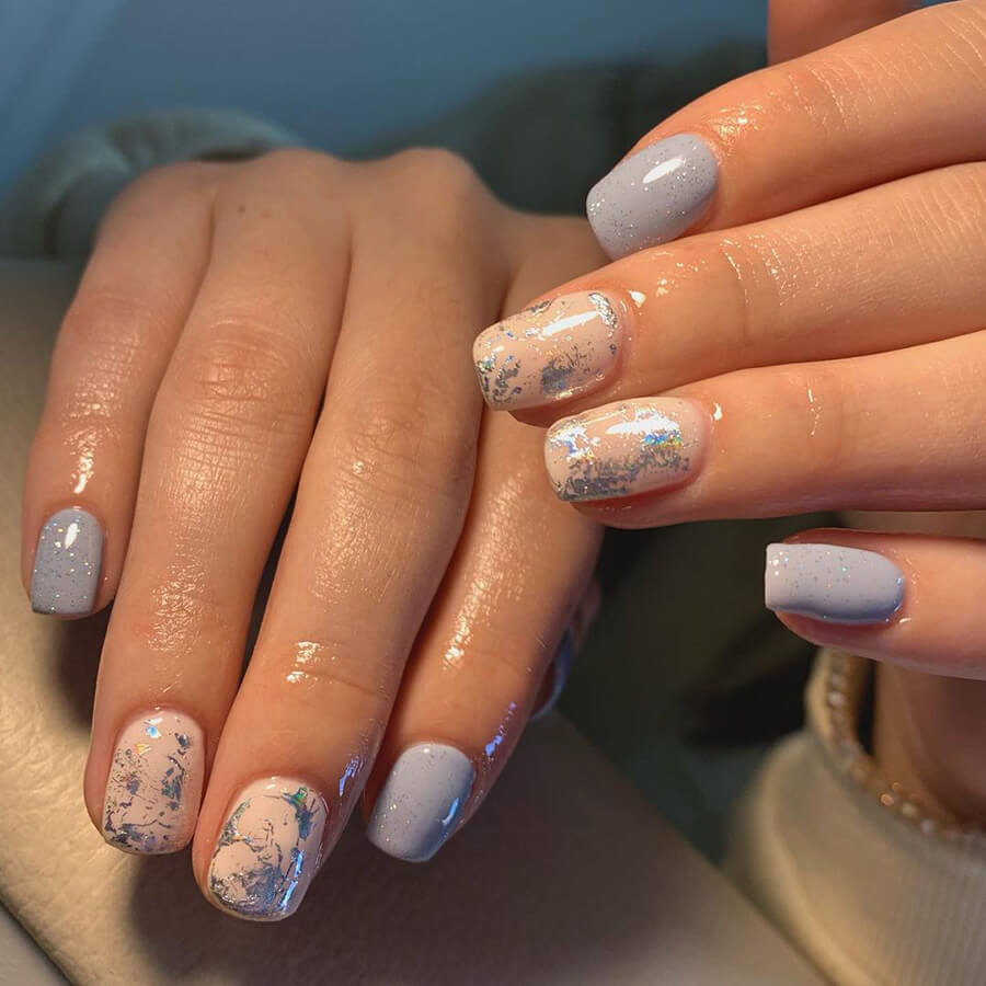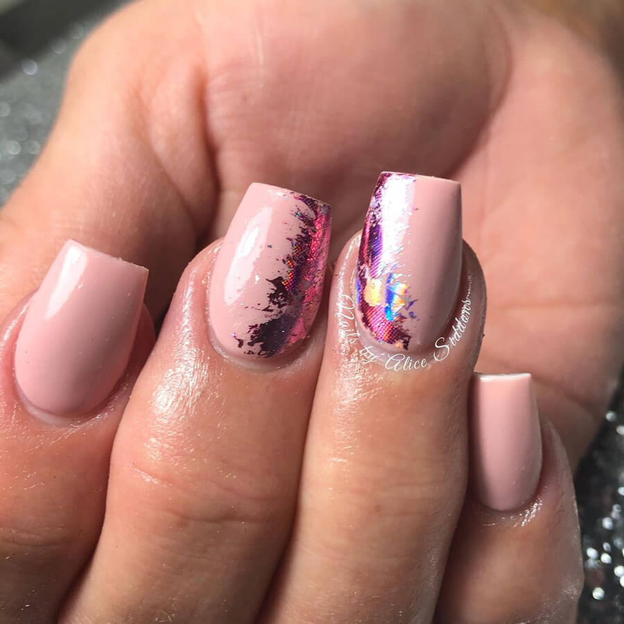 Если добавить кусочки фольги, то получится довольно лаконичный, но вместе с тем необычный и притягивающий внимание цвет. Вовсе не обязательно выполнять на все ногти