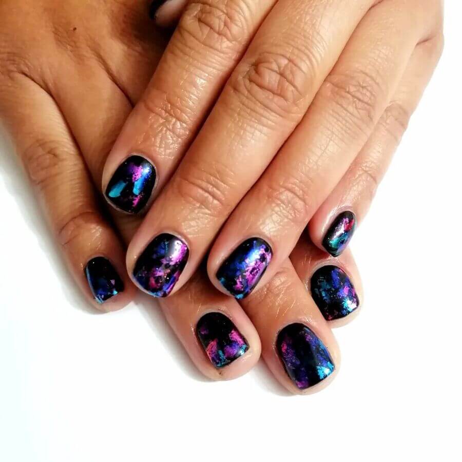 эффект голографии и переливов бензина наиболее привлекателен при максимально равномерном распределении. На лаке сделать это сложнее, нежели на топе для гель-лака. А значит, вам потребуется много практики;