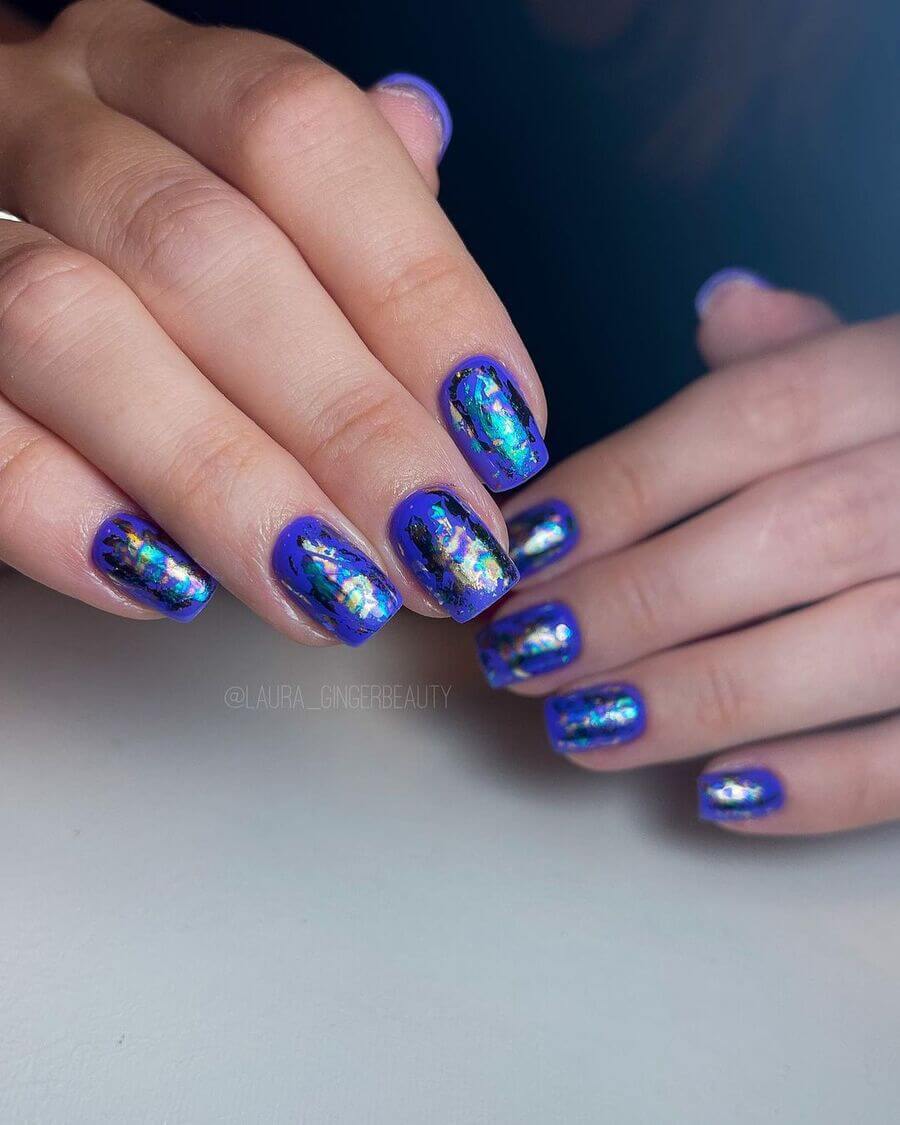 Голографический маникюр. Для смелого декора рекомендуем голографическую фольгу. Яркий и броский дизайн — отличное решение для молодежи. Если вы сомневаетесь в таком покрытии, то можно нарисовать его только на двух ногтях на каждой руке. Такой нейл арт очень актуален в этом сезоне, ведь зеркальный блеск сейчас в тренде.