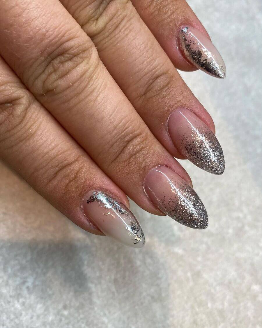 Глиттер-песок. Имеет высокую плотность, благодаря чему можно придать ногтевым пластинам дополнительный объём. Накладывается на ногти достаточно толстым слоем, из-за чего кажется, будто бы они усыпаны сияющим песком.