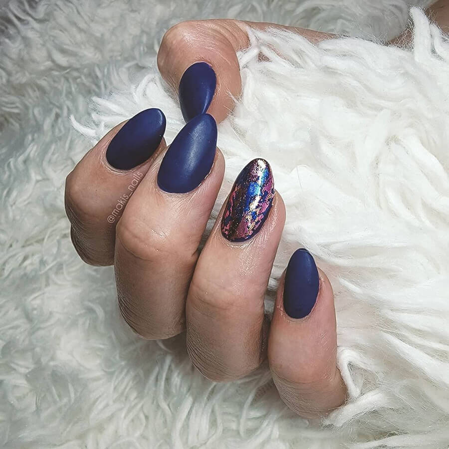 Достаточно сделать отпечаток на одном пальце. Такой дизайн подойдет для повседневной жизни. Обратите внимание на такие эффектные цвета — черный, синий, бордовый.