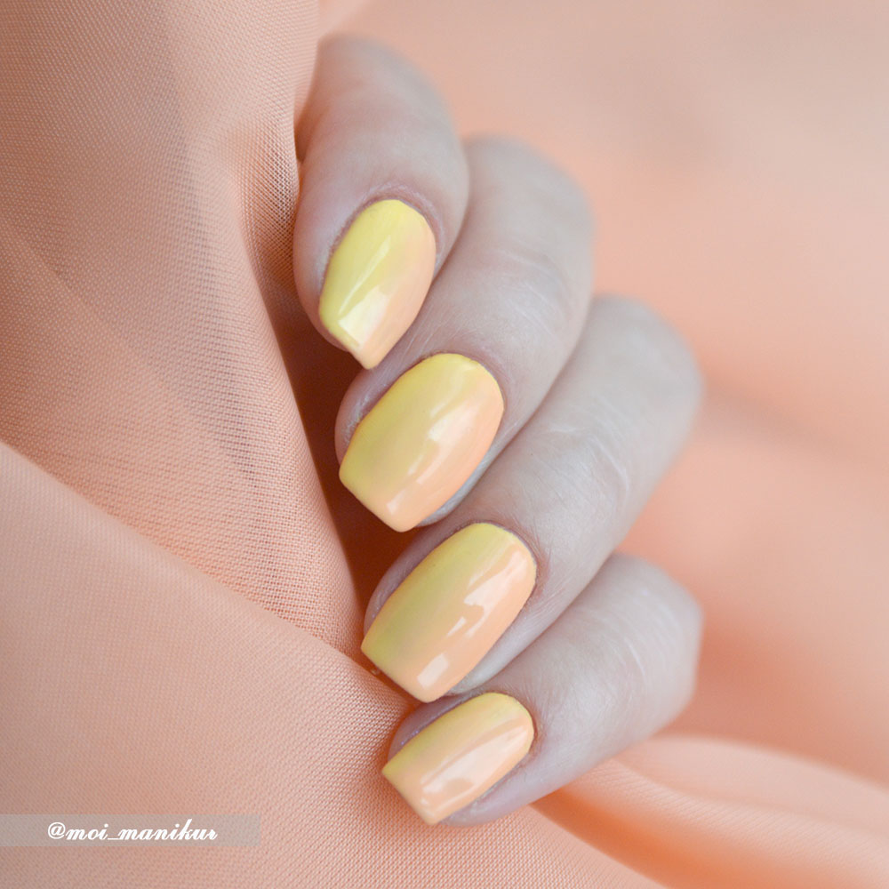 Вот так несложно создается вертикальный градиент гель-лаком. Я выбрала для своего варианта молочный желтый и светло-оранжевый цвета гель-лаков BlueSky Shellac, которые являются смежными в цветовом круге, поэтому их сочетание также смотрится очень органично и нежно.