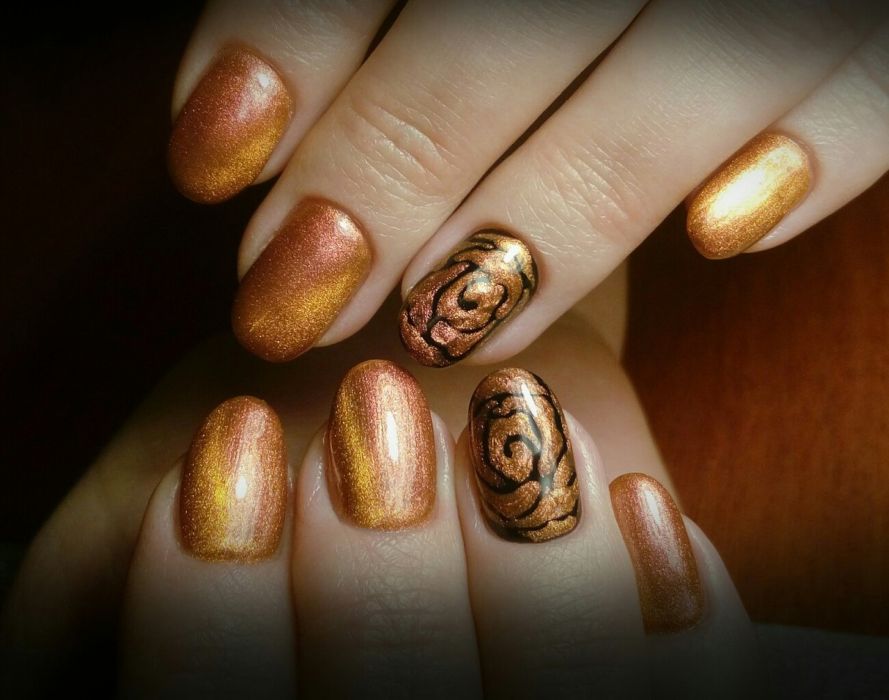 Для создания модного осеннего маникюра прекрасно подойдет золотое (золотой маникюр), медное или бронзовое покрытие ногтей. Это может быть фольгирование, маникюр с блестками или стразами, которые будут переливаться на солнце. Альтернативным вариантом может быть лак с наполнителем или перламутром.