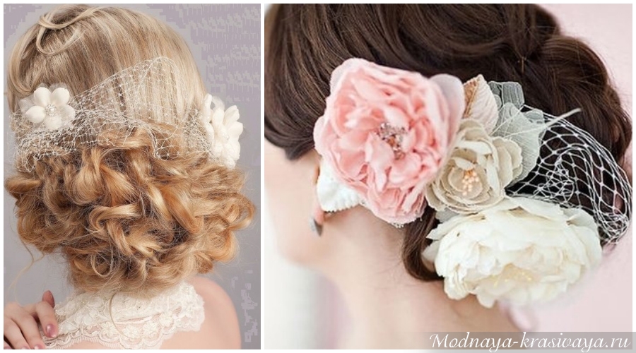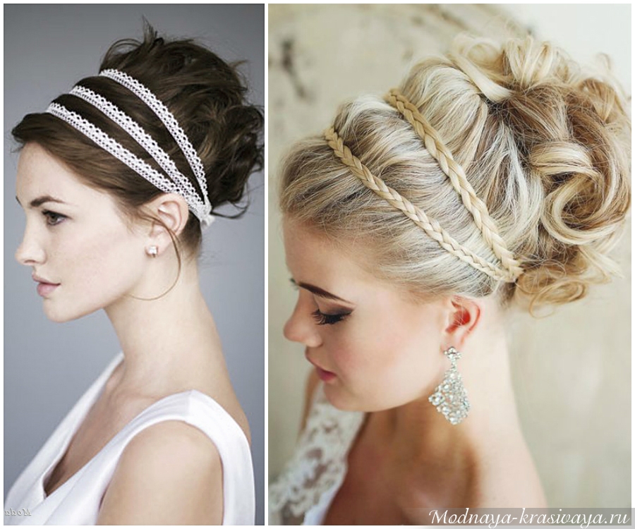 Пучок аккуратно оборачивается повязкой либо можно сплести из него нетугую, тонкую косичку. Такая укладка гармонично смотрится на завитых локонах.