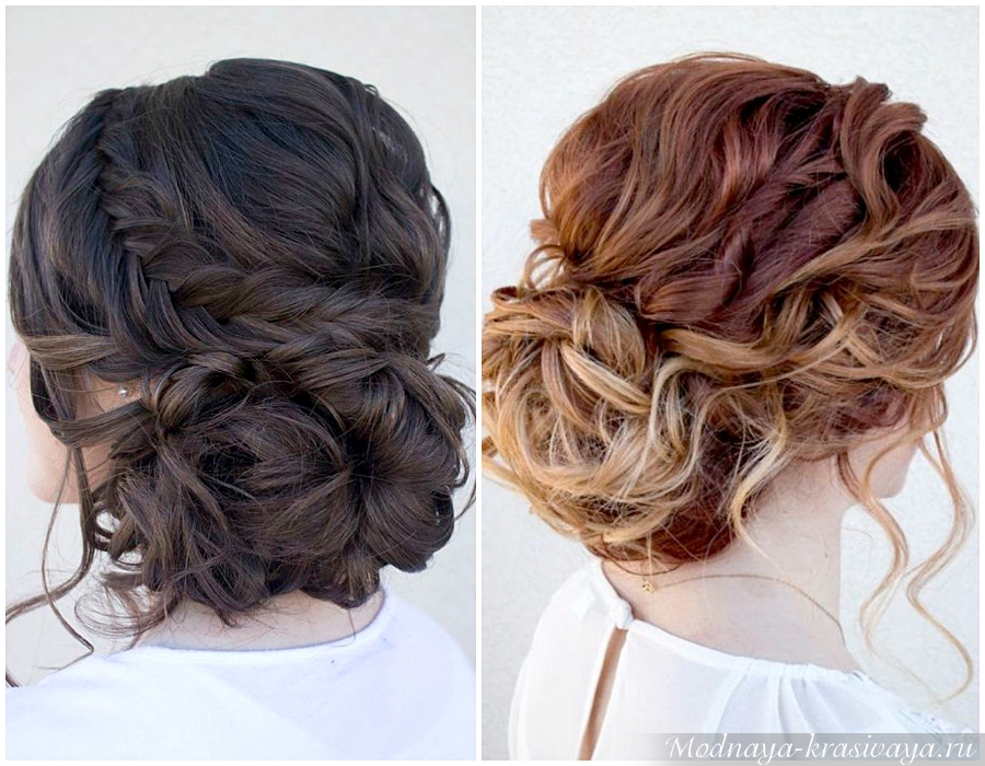 Небрежно собранные объёмные косы с выбившимися прядями – отличный вариант для нежной и хрупкой девушки. Заплести в виде венка или вывести плетение сбоку от лица – вариант зависит от предпочтений невесты.