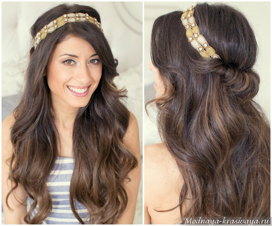 - Обладательницам длинных локонов можно просто надеть ободок, не заворачивая пряди или обернув несколько прядок у виска. Остальные волосы можно завить.