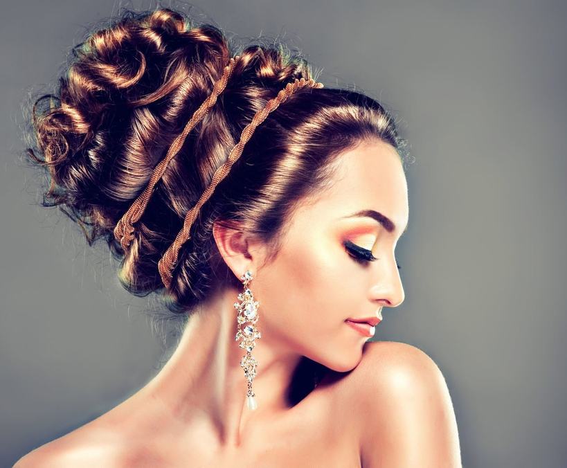 Образ для высокой вечерней прически, которую создаст и смоделирует мастер. Укладка стартует с прямого пробора. Далее берут крупную прядь на затылке, закрепляют ее резинкой и завивают в форме удлиненного локона. Тоже исполняют с остальными элементами. Когда накрутка завершена, то отбрасывают шевелюру назад, закрепляют ее рядом с первой прядью. Свободные края укладывают в узел, внизу которого искусно оплетают одну или две косички из неиспользованных локонов. Сверху украшают диадемой или тройным обручем. Создается и планируется лампадион для торжественных раутов с элегантными убранствами, украшенными нитями-серьгами и колье из одной коллекции. Восторг и восхищение исторгаются от созерцания роскоши.