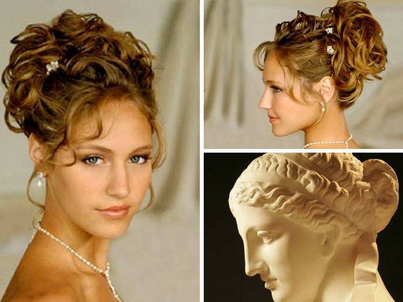 Отличное решение для курчавых локонов среднего размера. Легкий начес у корней, затем собрать пряди на макушке в хвост. На голову надеть двойной обруч. Молодежный образ для студенток и старших школьниц, умеющих оценить и принять прелесть Греции.
