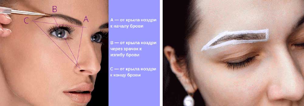 основание или начало брови. Тут поставь две точки – одна на уровне максимального роста волос у переносицы, вторая под ней на нужном уровне – постановка этой точки зависит от желаемой ширины;