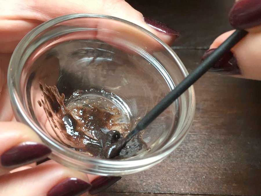 Раствор хны просто делается в домашних условиях. В подготовленную емкость высыпаем 1 ч. л. порошка и понемногу добавляем теплой воды, постоянно помешивая. Нужно добиться консистенции густой сметаны. Для подбора необходимого тона бровей вы должны регулировать пропорции хны и басмы (она добавляется понемногу в готовую смесь). Цвет раствора будет на один тон темнее, чем получаемый оттенок. Басма может придать цвет от темно-коричневого до черного, в зависимости от ее количества в готовой смеси.