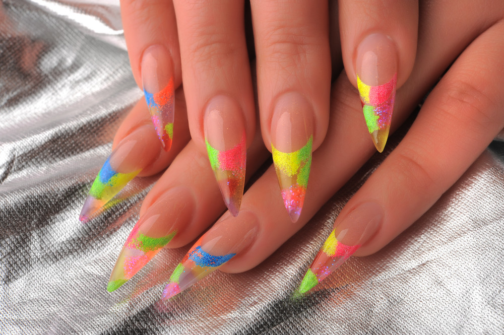 - На удлинённый конец ногтя наносят тонкий слой геля. Сверху выкладывают глиттеры разных цветов. Сушат в УФ-лампе.
