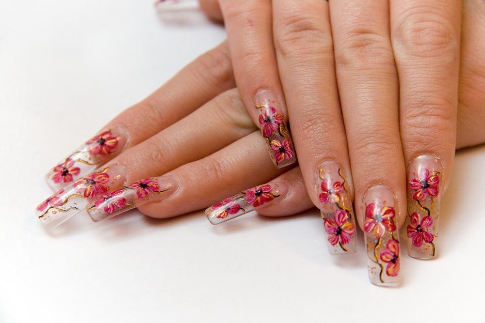 - На обработанный натуральный ноготь накладывают тонкий слой просвечивающегося акрила. Пока он не застыл, наносят готовые элементы в виде цветов, сердечек или других украшений.