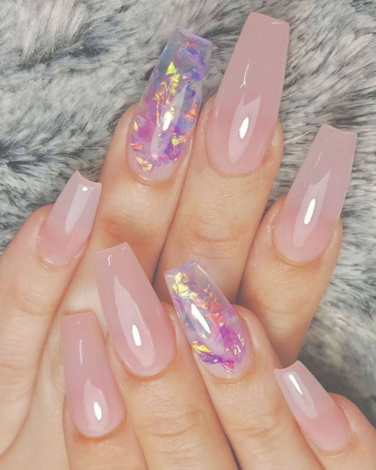 - Лаконично смотрится нюдовый фон со стразами и блестками. Такой дизайн может стать достойным дополнением любого лука.