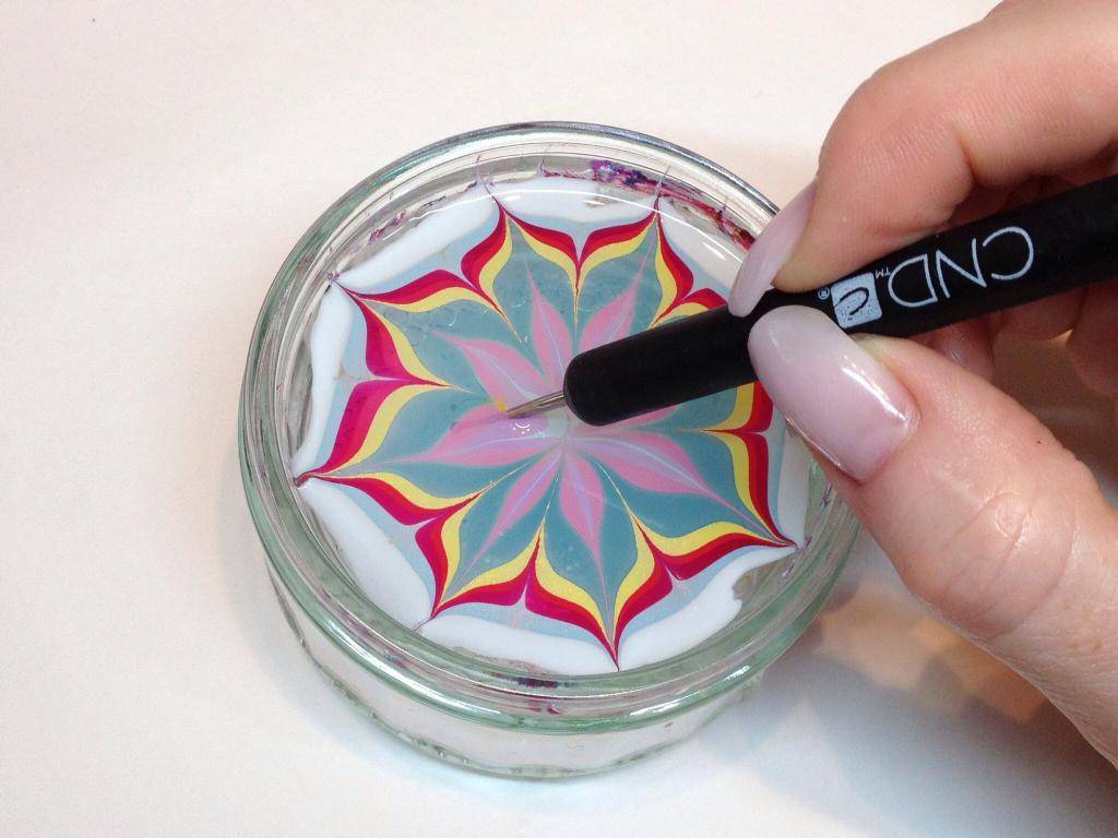 - Используя зубочистку, создают разводы (как получится), чтобы оттенки смешались.