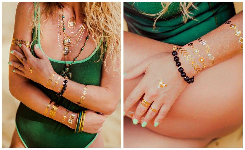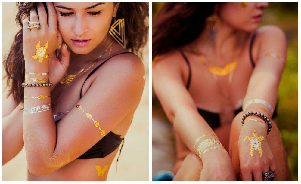 Как видите, золотистые татуировки легко наклеить самостоятельно. Единственное, если вы задумали разместить рисунок на спине между лопатками, без помощника не обойтись.
