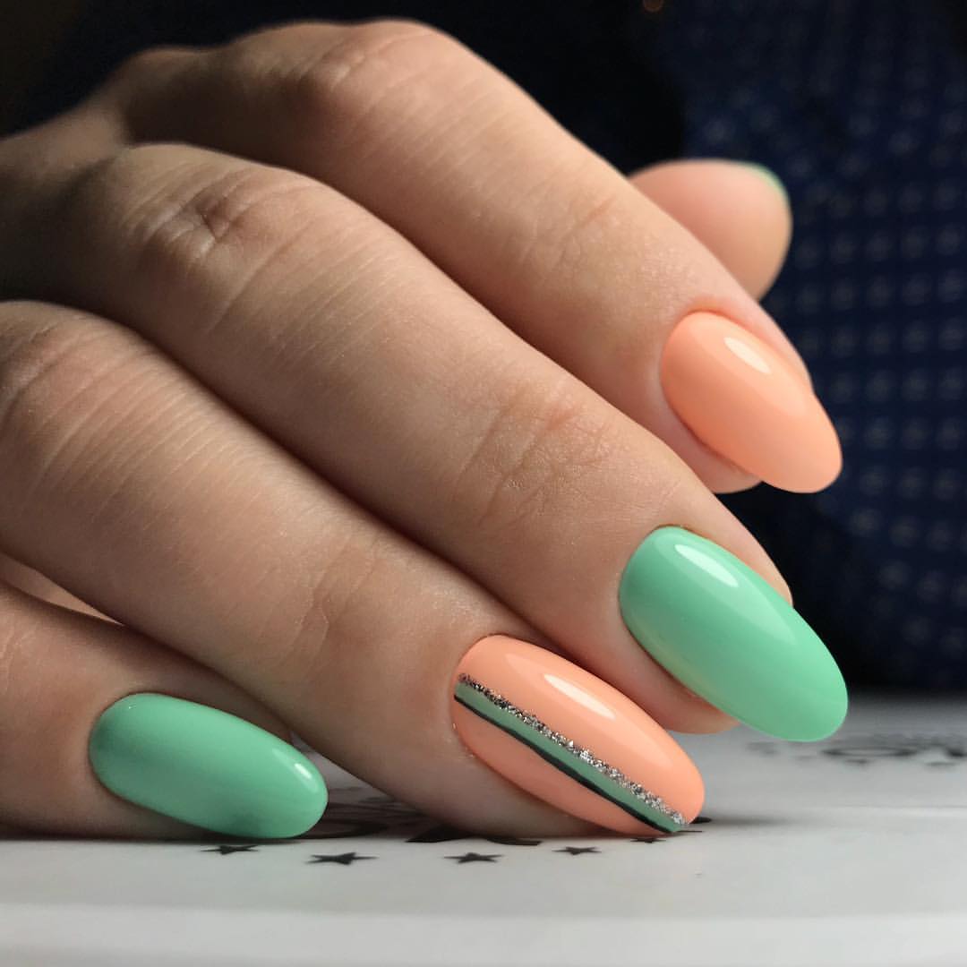 Розовый в сочетании с персиковым цветом используется не столь часто. Однако тем, кто любит нюдовый дизайн, стоит присмотреться именно к такому варианту. Персиково-мятный маникюр в отличии от предыдущего варианта, особенно актуальный в 2020 году. Эти оттенки хорошо смотрятся в одном дизайне, дополняют друг друга.