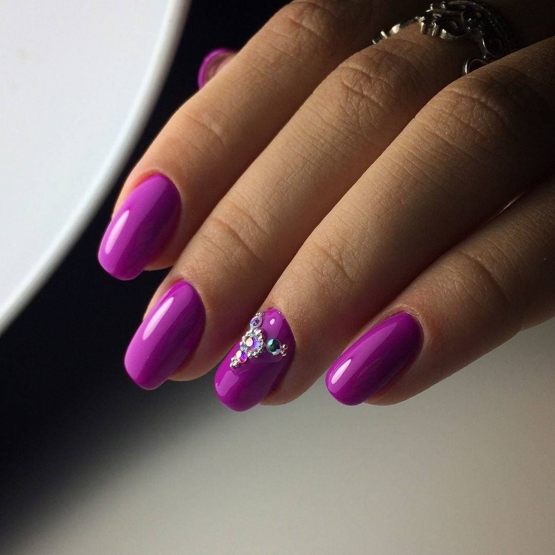 Дополнить фиолетовый маникюр можно при помощи техники стразов, что придаст ему большей изящности