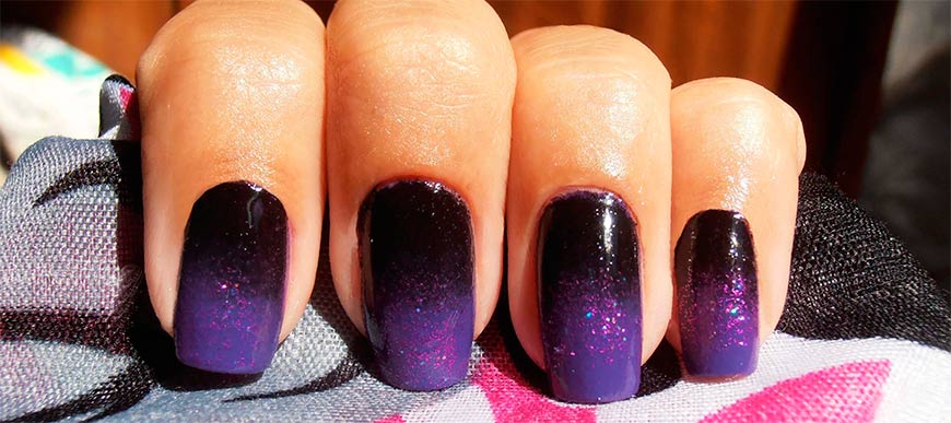 Если вы хотите, чтобы однотонный маникюр смотрелся интереснее, то используйте несколько оттенков фиолетового. Достаточно выбрать два схожих полутона фиолетового, чтобы однотонный маникюр выглядел динамичнее и эффектнее. Нейл-мастера рекомендуют использовать для однотонного покрытия глянцевые гель-лаки. На матовой поверхности фиолетовый цвет будет выглядеть тускло, нуждаться в блестящем декоре стразами, бульонками, глиттером.