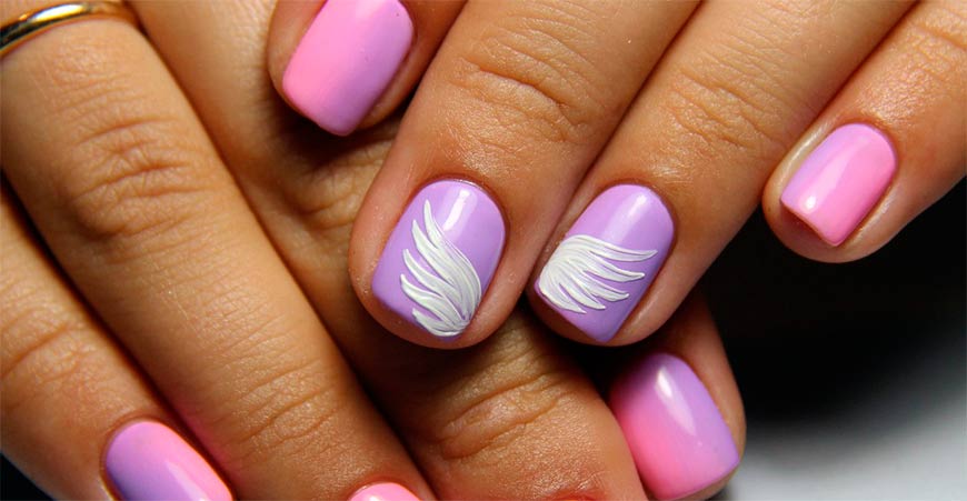 - Фиолетовый+розовый. Невероятно нежное сочетание цветов смотрится на женских руках элегантно и мило. Оттенки идеально подходят для создания выразительного повседневного нейл-арта.