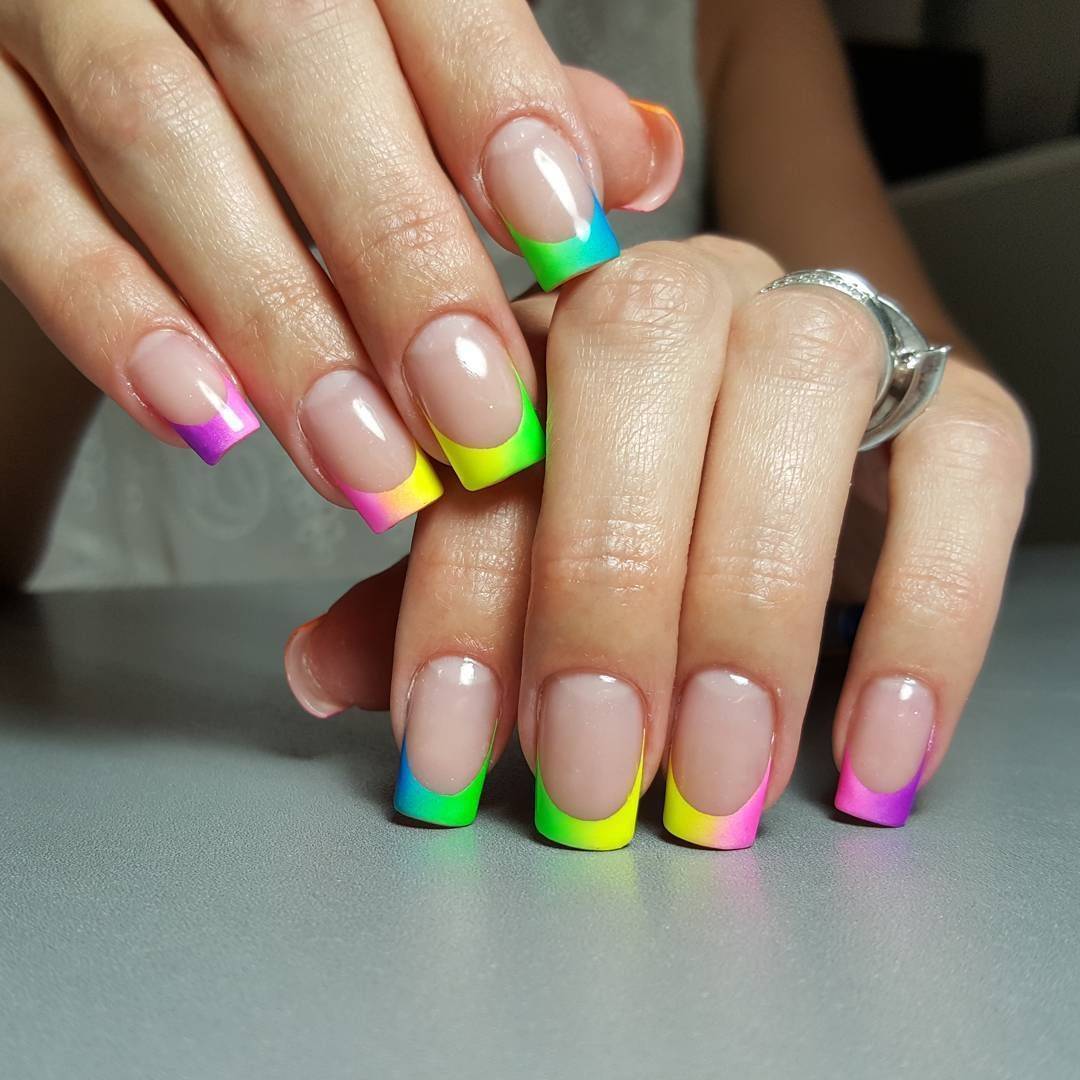 С французским маникюром нередко комбинируют радужный дизайн. Это плавный переход оттенков для которого используются все цвета радуги. В результате получается яркий, свежий маникюр — идеальный вариант на лето.