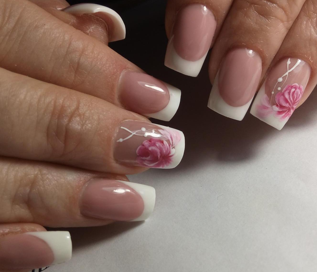 Не менее популярный рисунок, который отлично смотрится в сочетании с френчем – флористический. Опытные нейл-мастера делают потрясающие шедевры с помощью нескольких кистей и акриловых красок.
