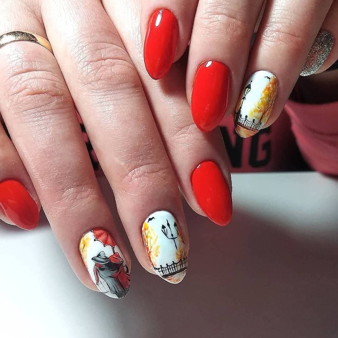 Также, очень стильно и нежно смотрятся красные ноготки в сочетании с несколькими молочными или нюдовыми ноготками, на которые нанесены надписи черного или красного цвета.