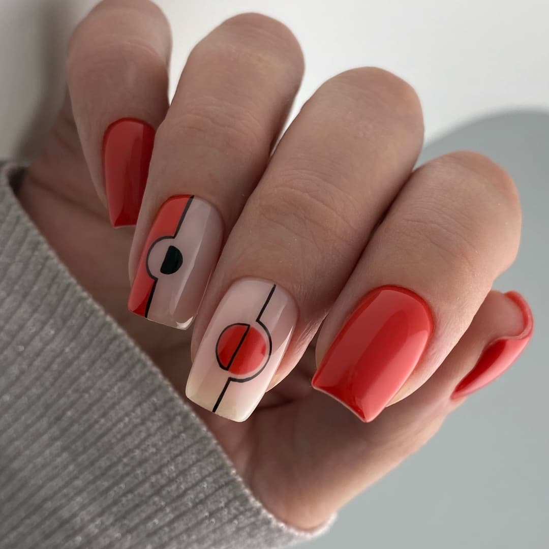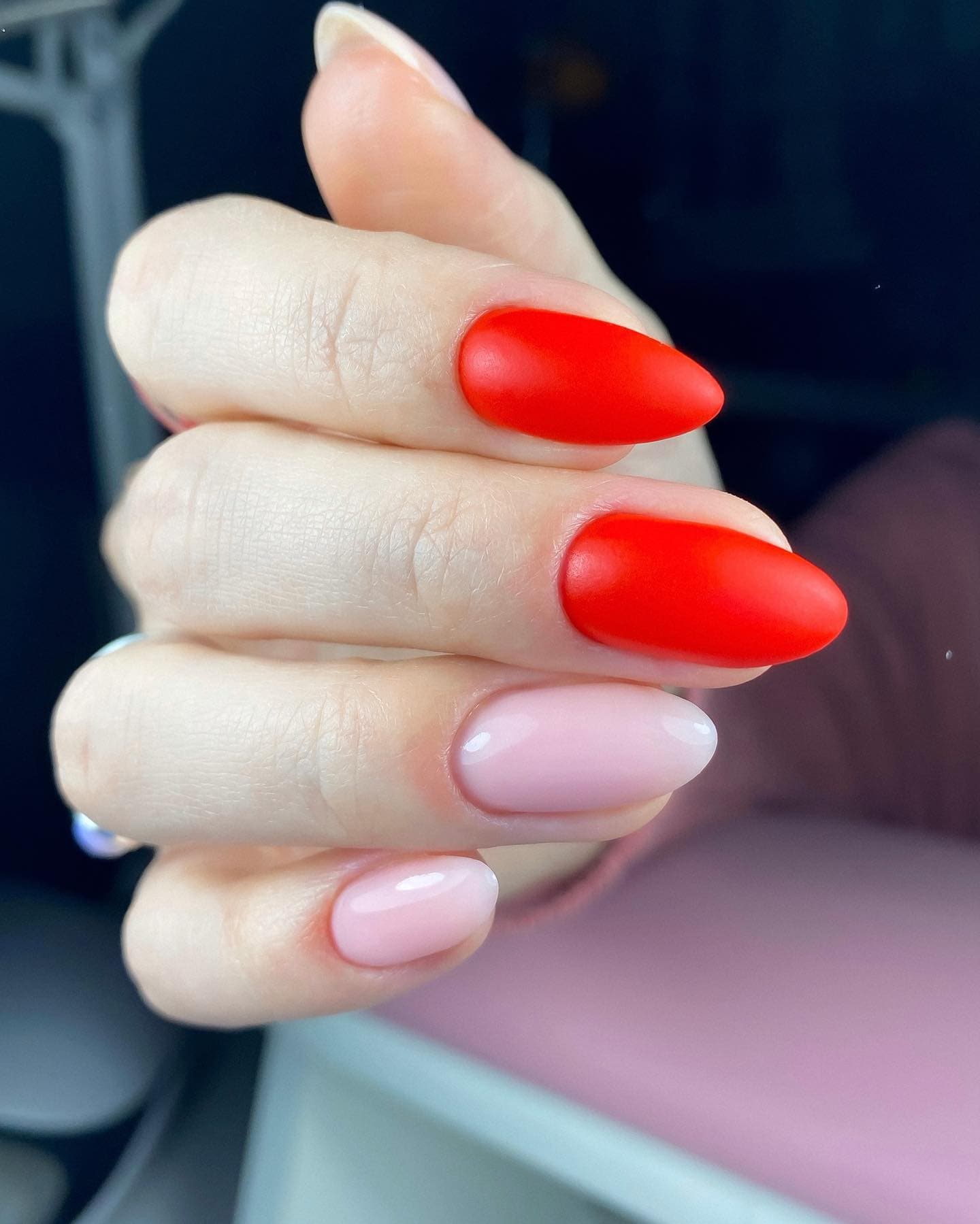 Модный красный маникюр 2021 года предполагает прежде всего использование негативного пространства. Присутствие в маникюре лака, близкого к цвету ногтя делает дизайн более нежным и естественным.