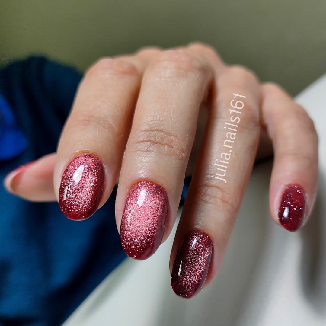 Что касается красного дизайна с втиркой, то в этом году лидирует зеркальная и жемчужная втирка. Они могут быть нанесены как на все, так и только на пару ноготков. Плюс, можно дополнить такой дизайн стразами, градиентом или красивым рисунком.