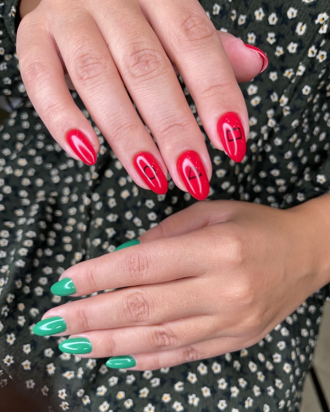 - маникюр красный с черным, блестками среднего и крупного, либо среднего и малого размера;